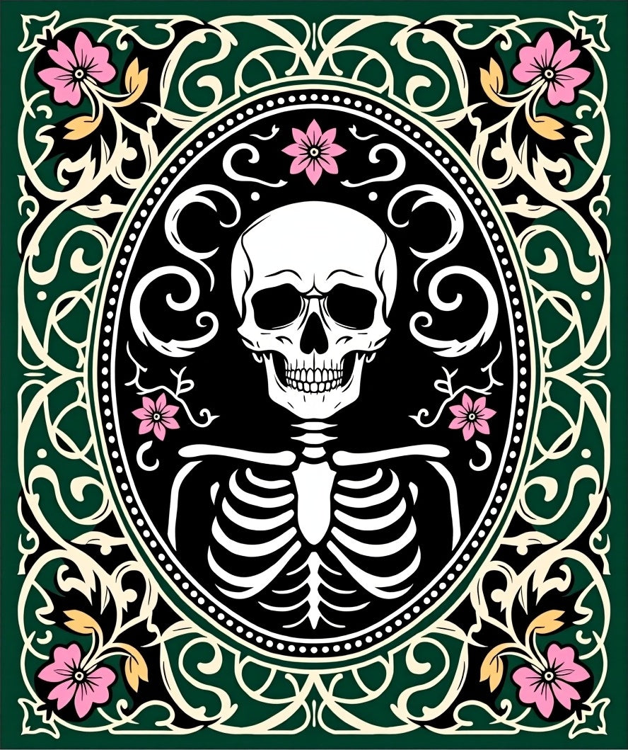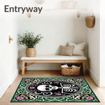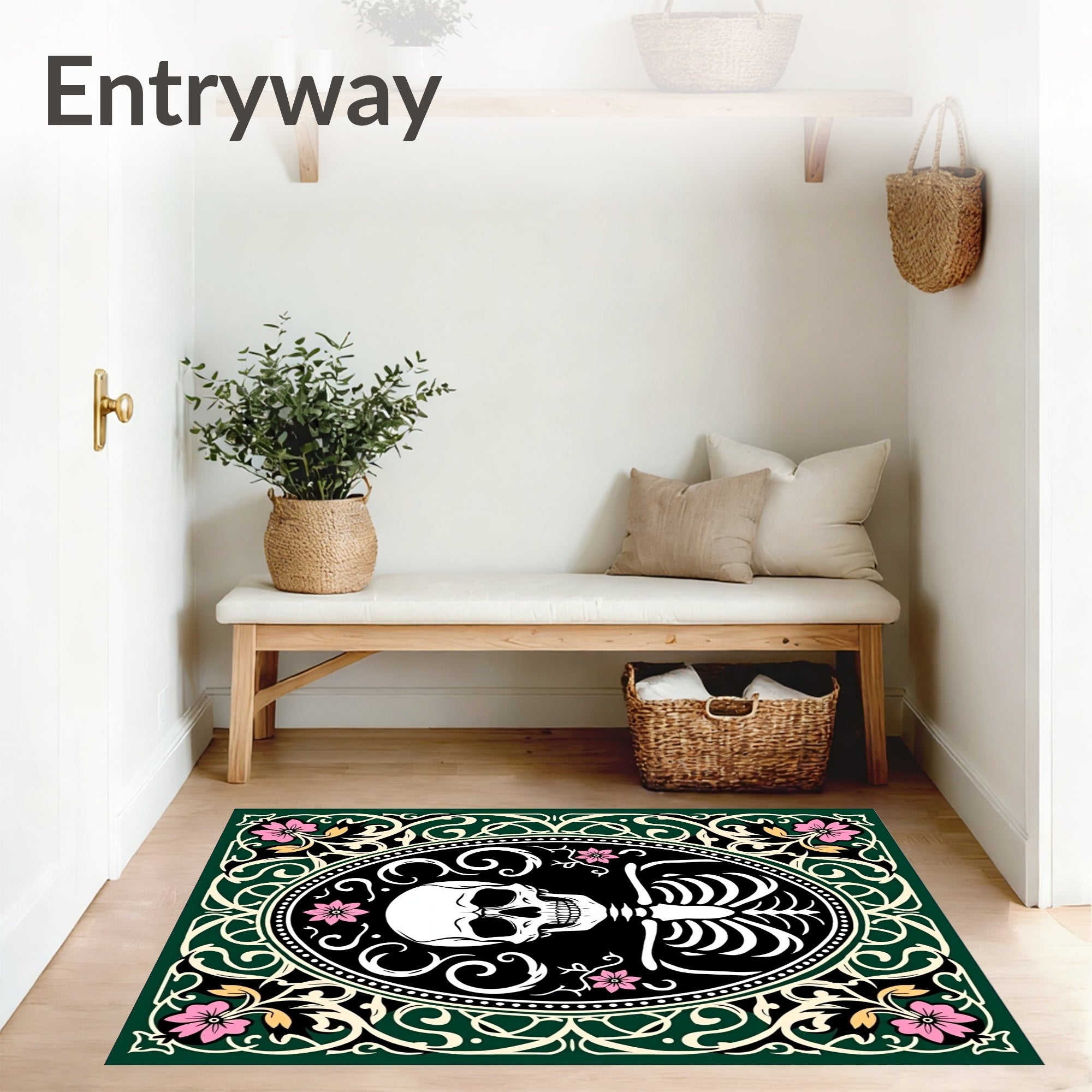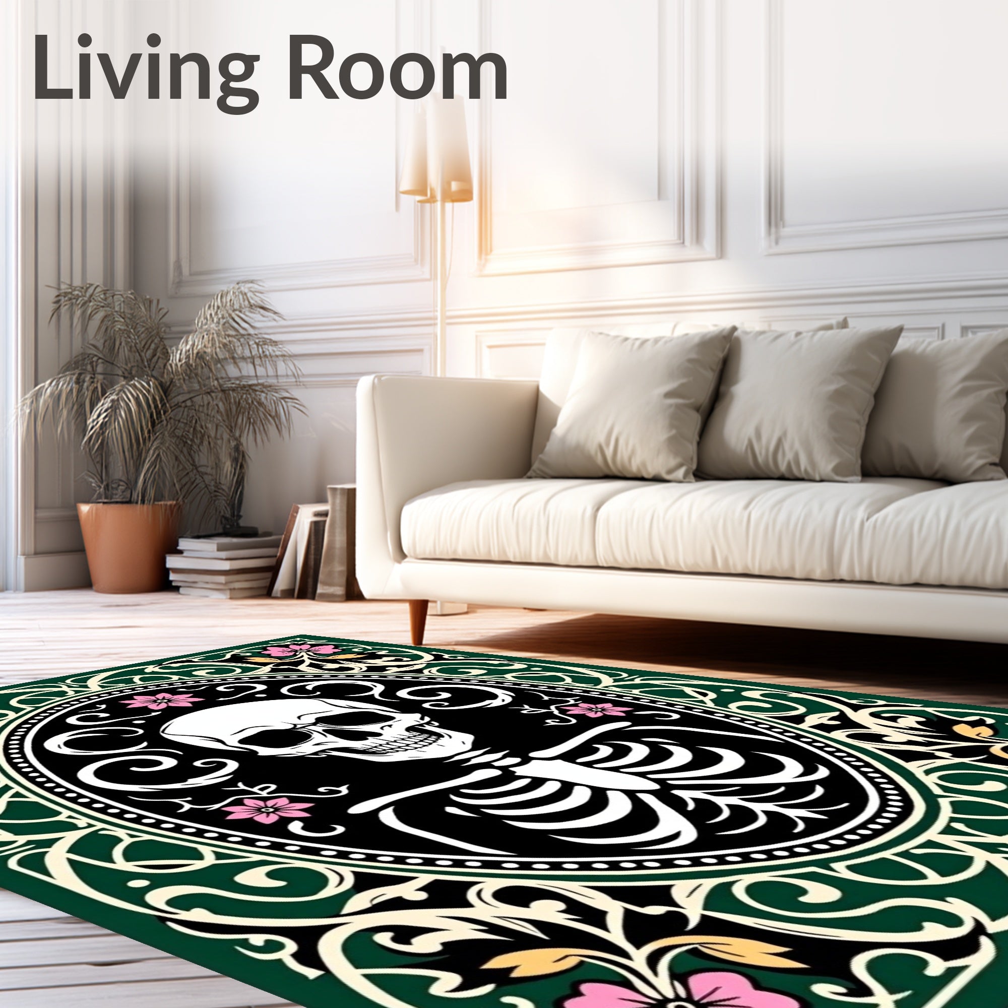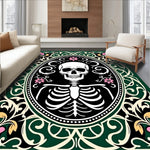 Ultra Soft Area Rug, Non Slip, Stain Resistant, Washable Area Rugs for Living Room, Bedroom, Victorian Skeleton Cameo with Interlocking Floral Scrolls(Green) Overview: