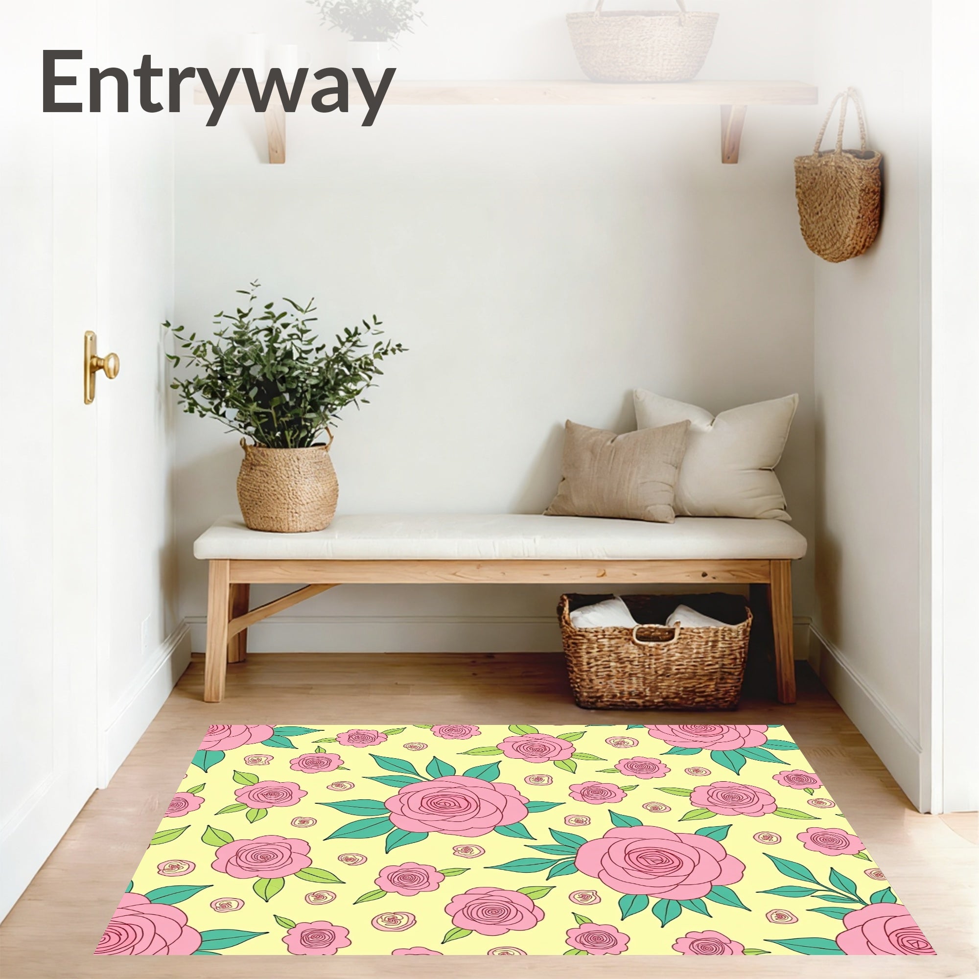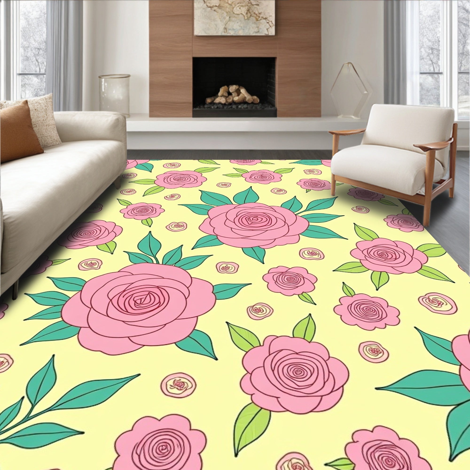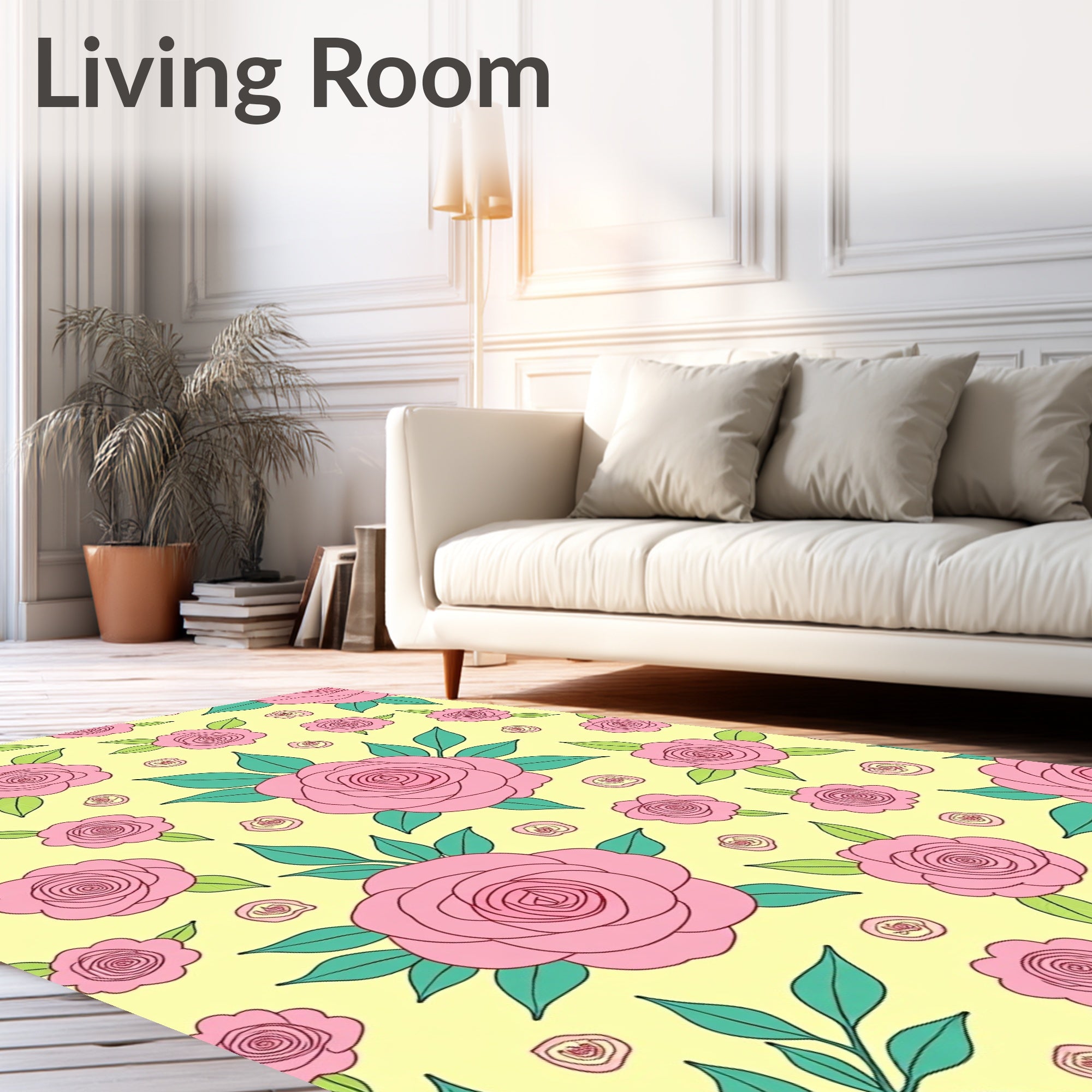 Ultra Soft Area Rug, Non Slip, Stain Resistant, Washable Area Rugs for Living Room, Bedroom, Vintage Cottage Rose Medley with Subtle Scrollwork and Petite Blossom Clusters(Pink) Overview: