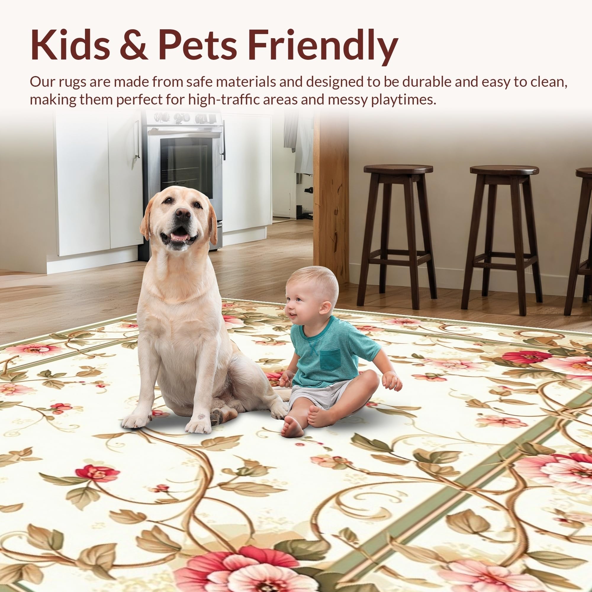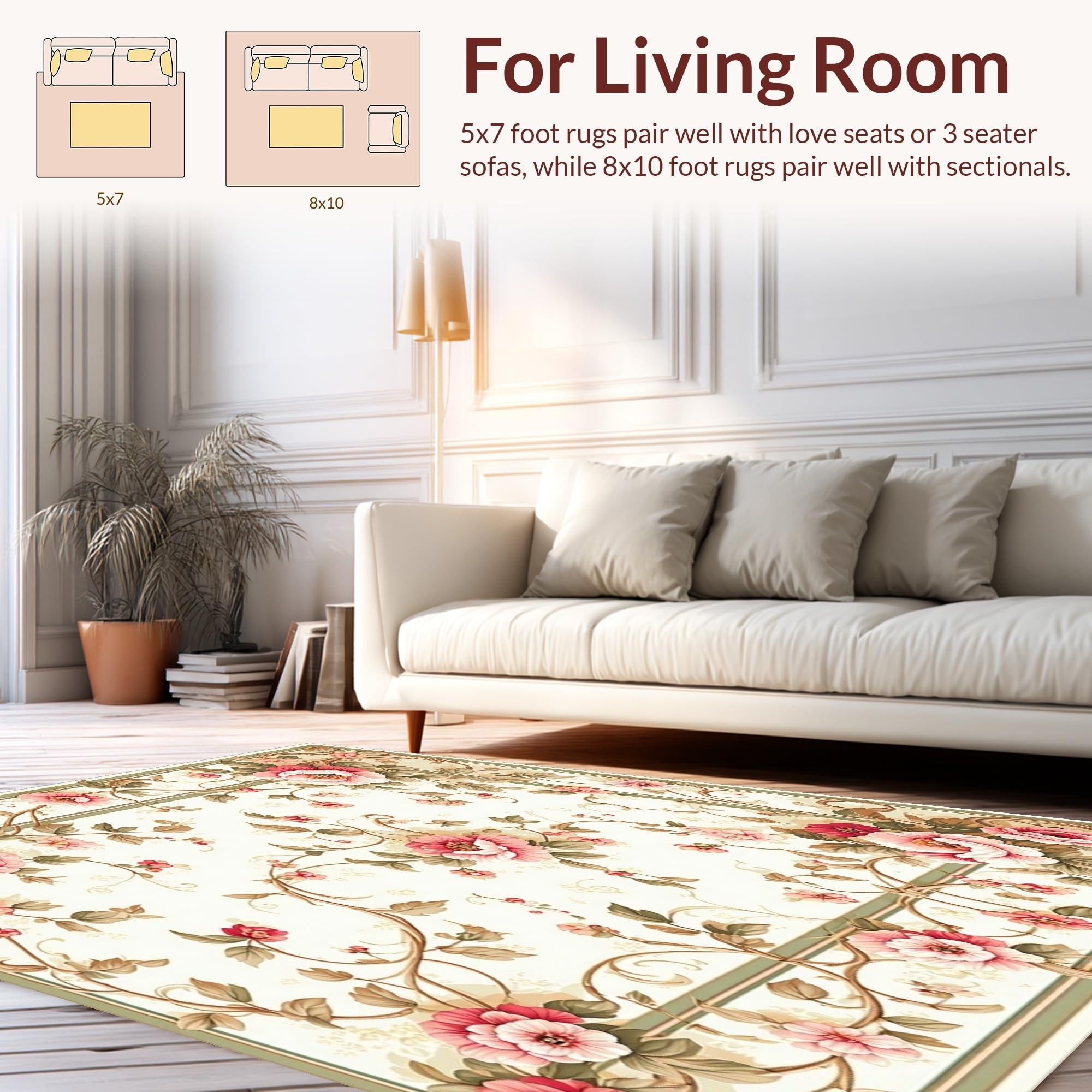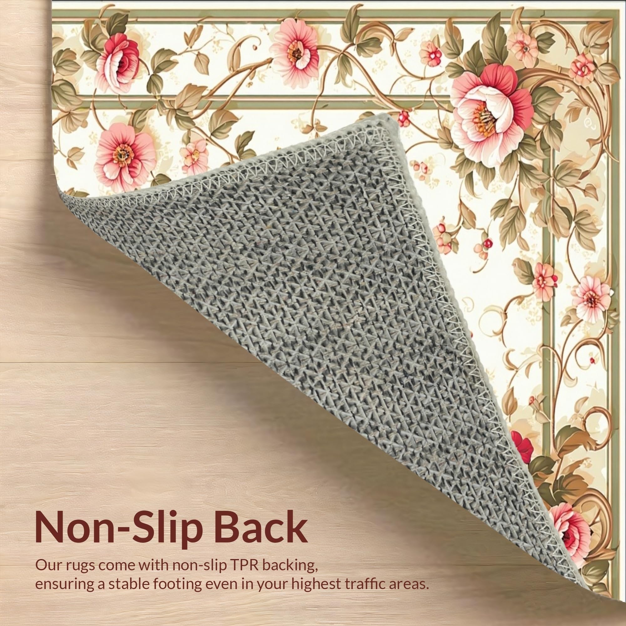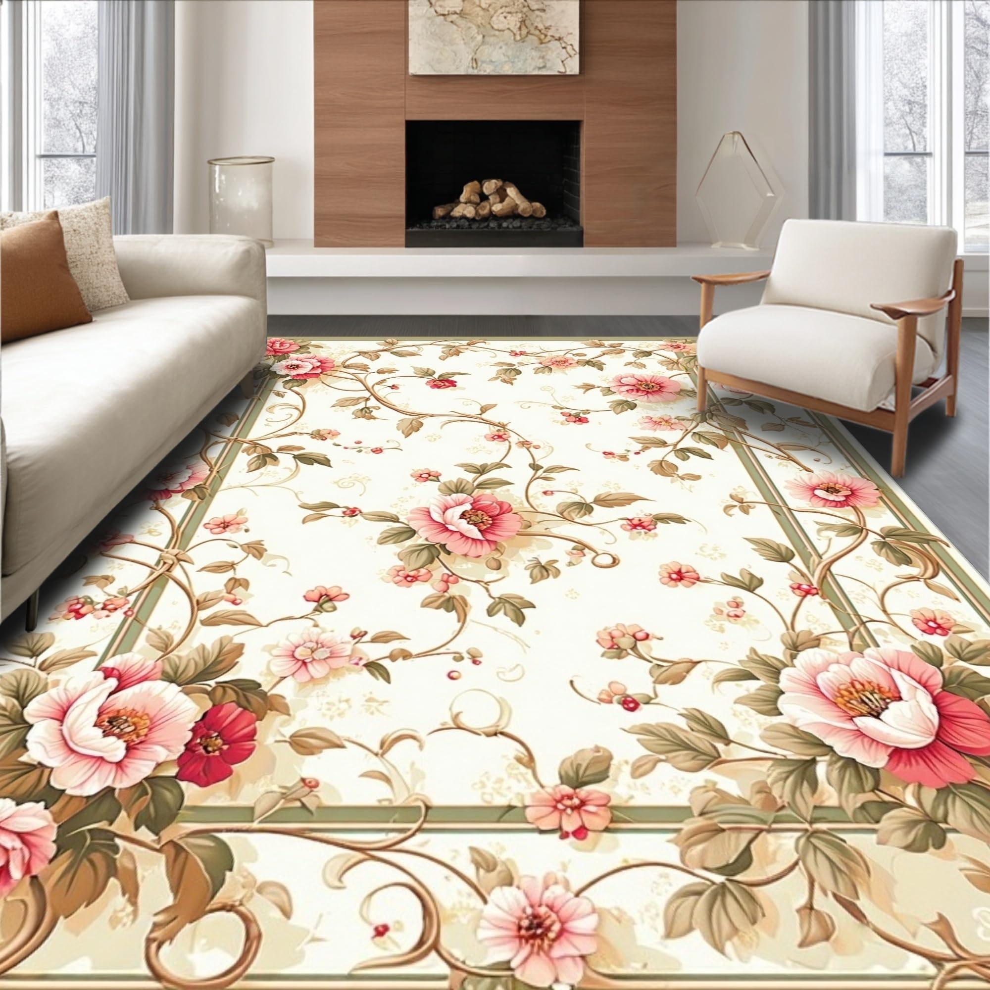 Ultra Soft Area Rug, Non Slip, Stain Resistant, Washable Area Rugs for Living Room, Bedroom, Vintage Floral Boho Pink Green Botanical Motifs Non Slip(Beige) Overview: