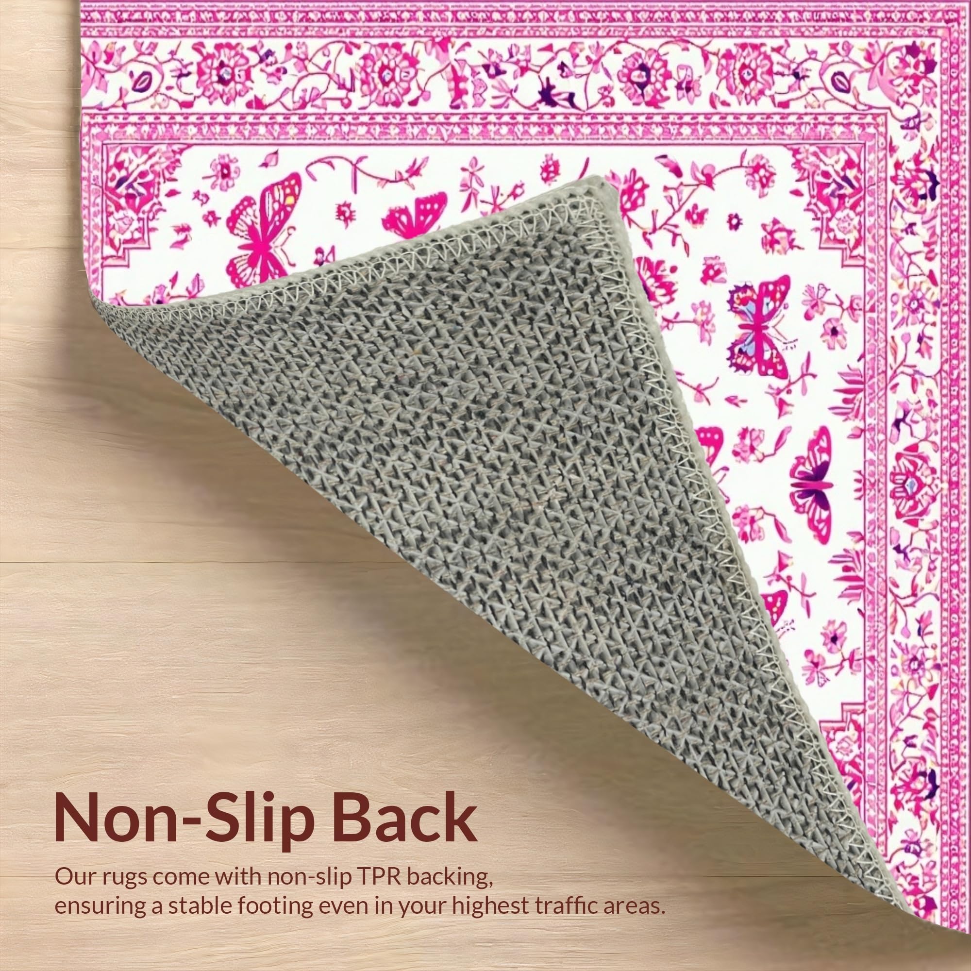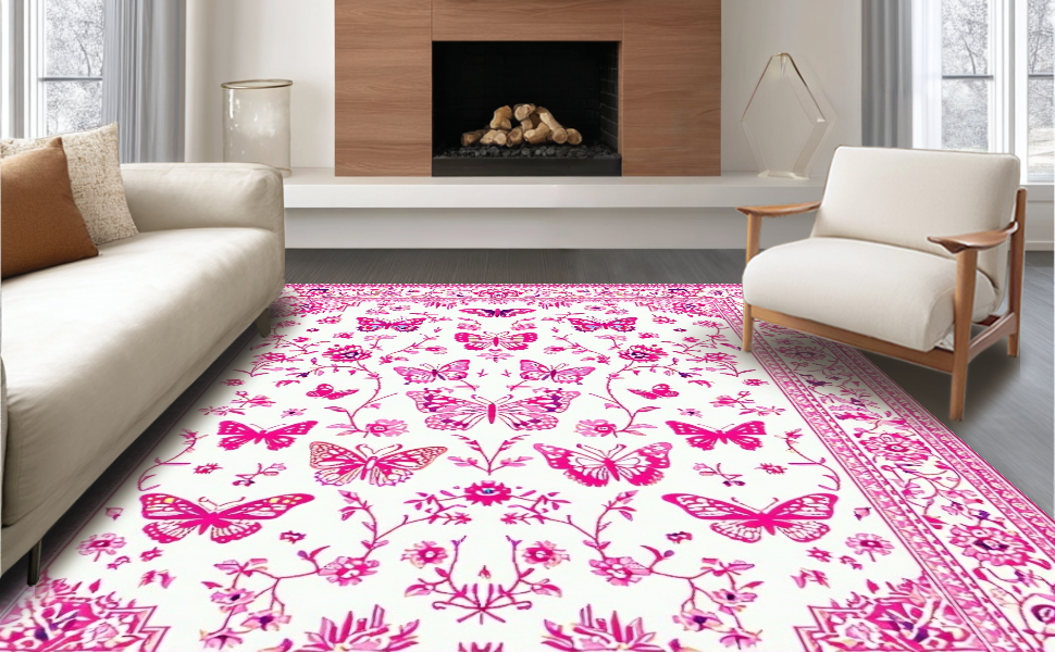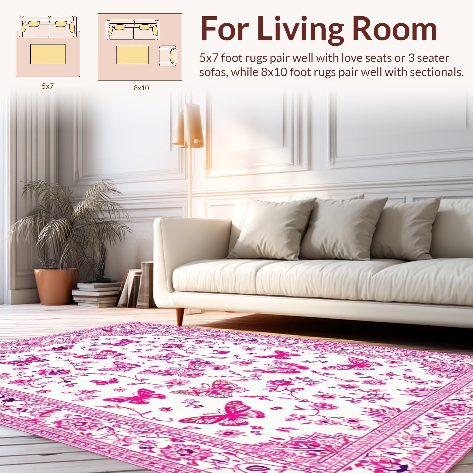 Ultra Soft Area Rug, Non Slip, Stain Resistant, Washable Area Rugs for Living Room, Bedroom, Vintage Floral Butterfly Medley(White) Overview: