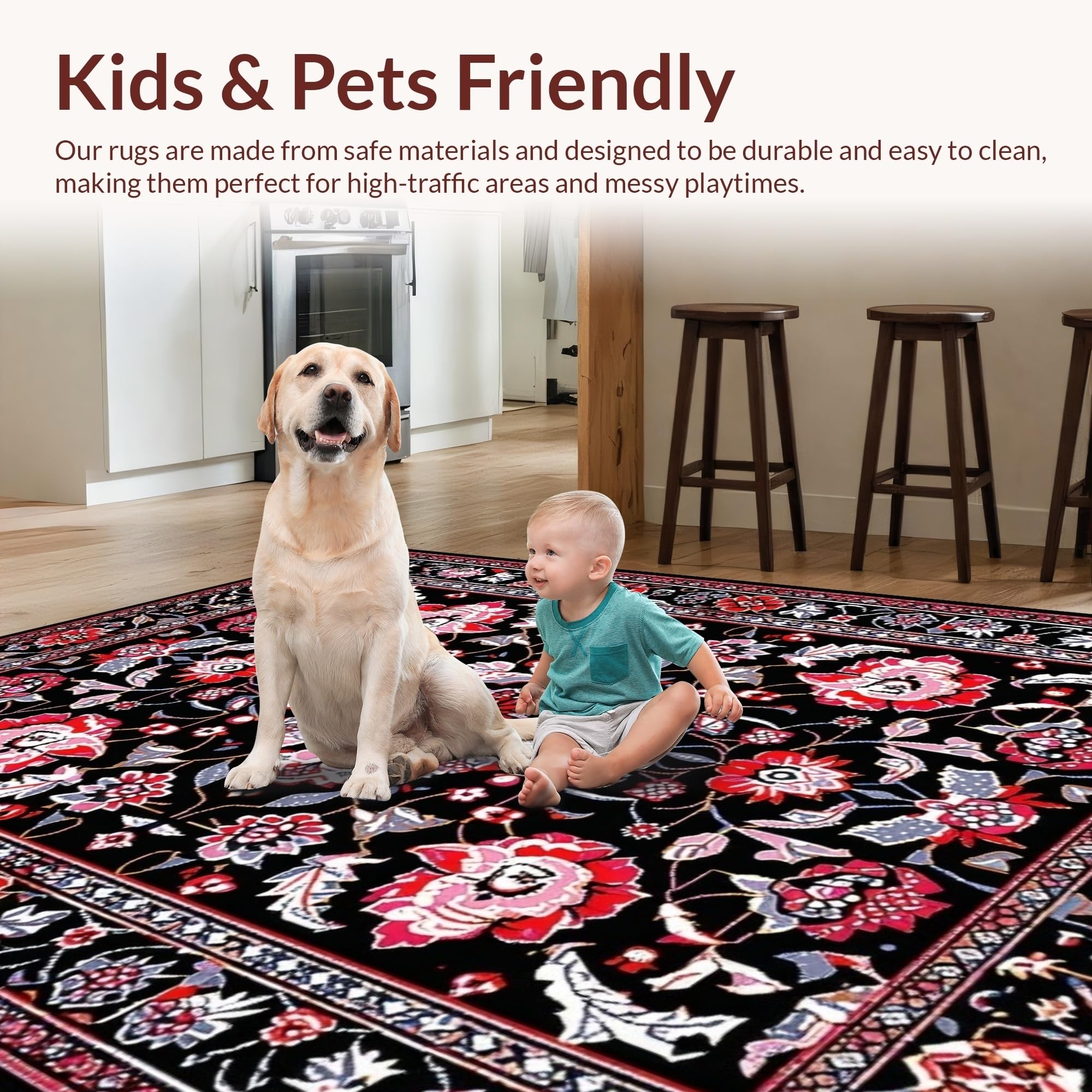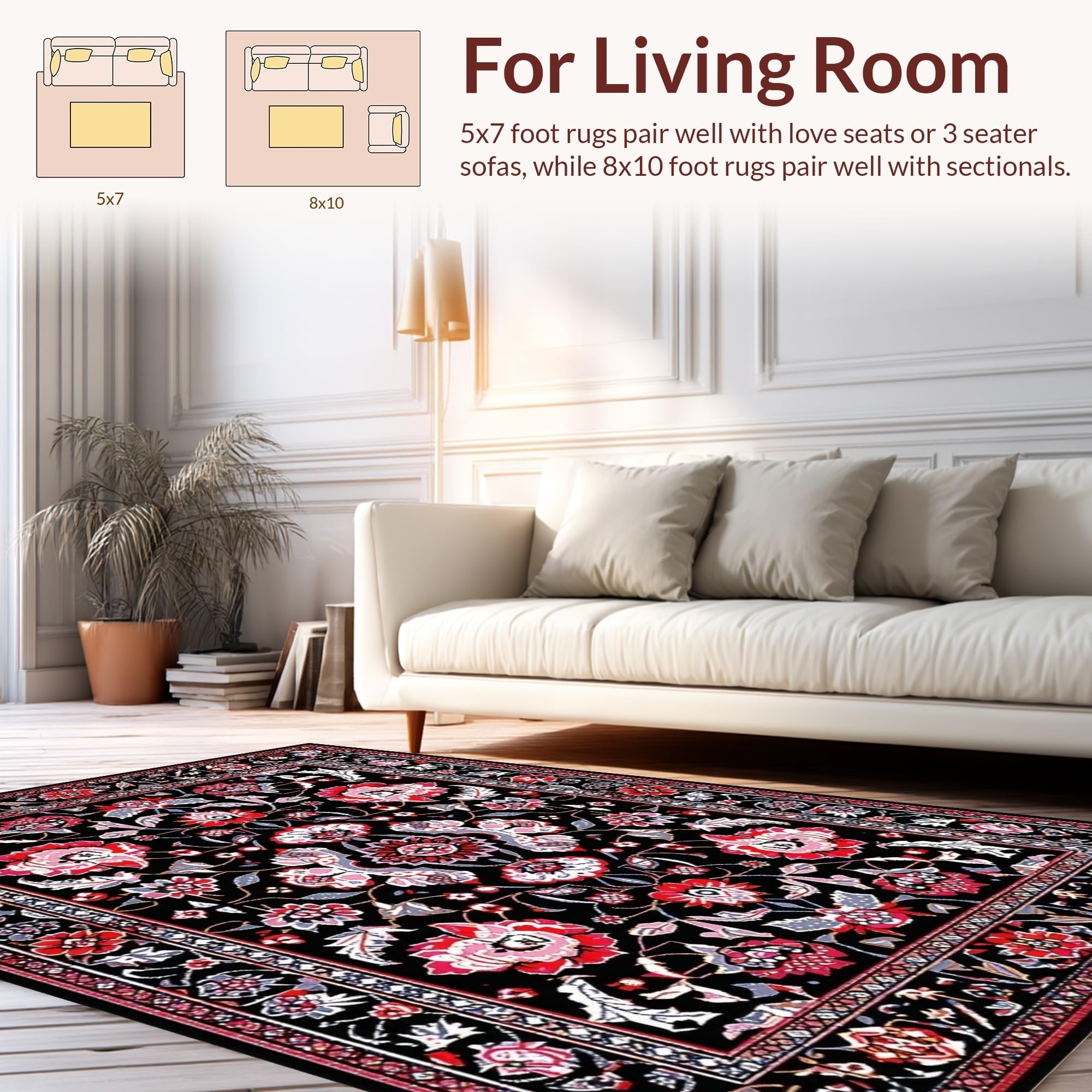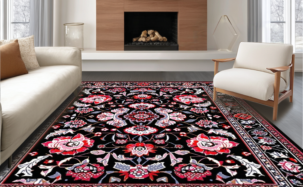 Ultra Soft Area Rug, Non Slip, Stain Resistant, Washable Area Rugs for Living Room, Bedroom, Vintage Floral Medallion Design(Black) Overview: