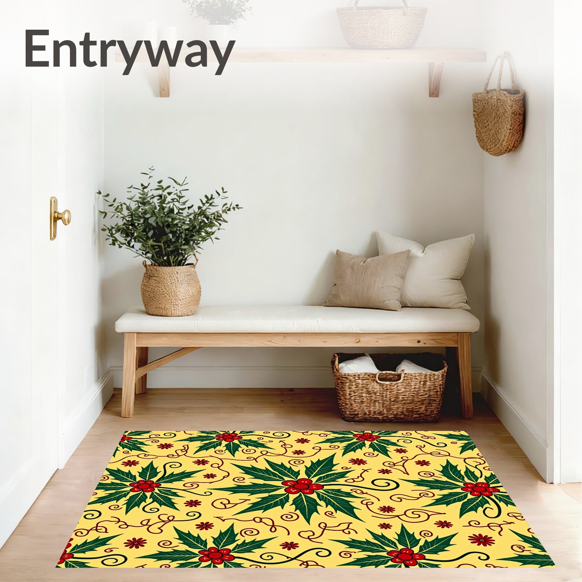 Flatwoven High Traffic Area Rug, Vintage Holiday Holly Leaf With Elegant Festive Motifs, Non Slip, Stain Resistant, Washable Area Rugs for Living Room, Bedroom (Yellow) Overview:
