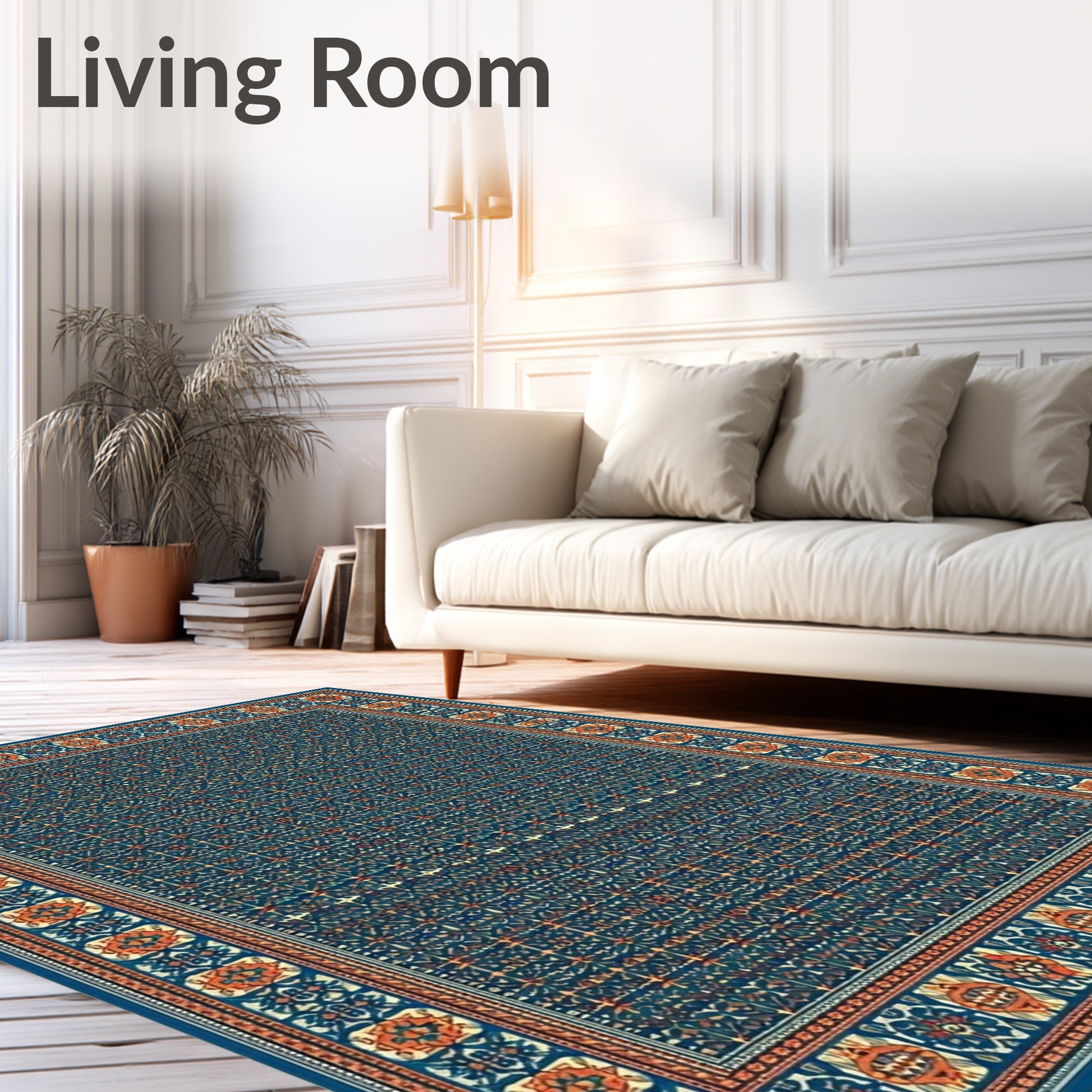 Ultra Soft Area Rug, Non Slip, Stain Resistant, Washable Area Rugs for Living Room, Bedroom, Vintage Inspired Area with Intricate Blue and Orange Geometric Design(Blue) Overview:
