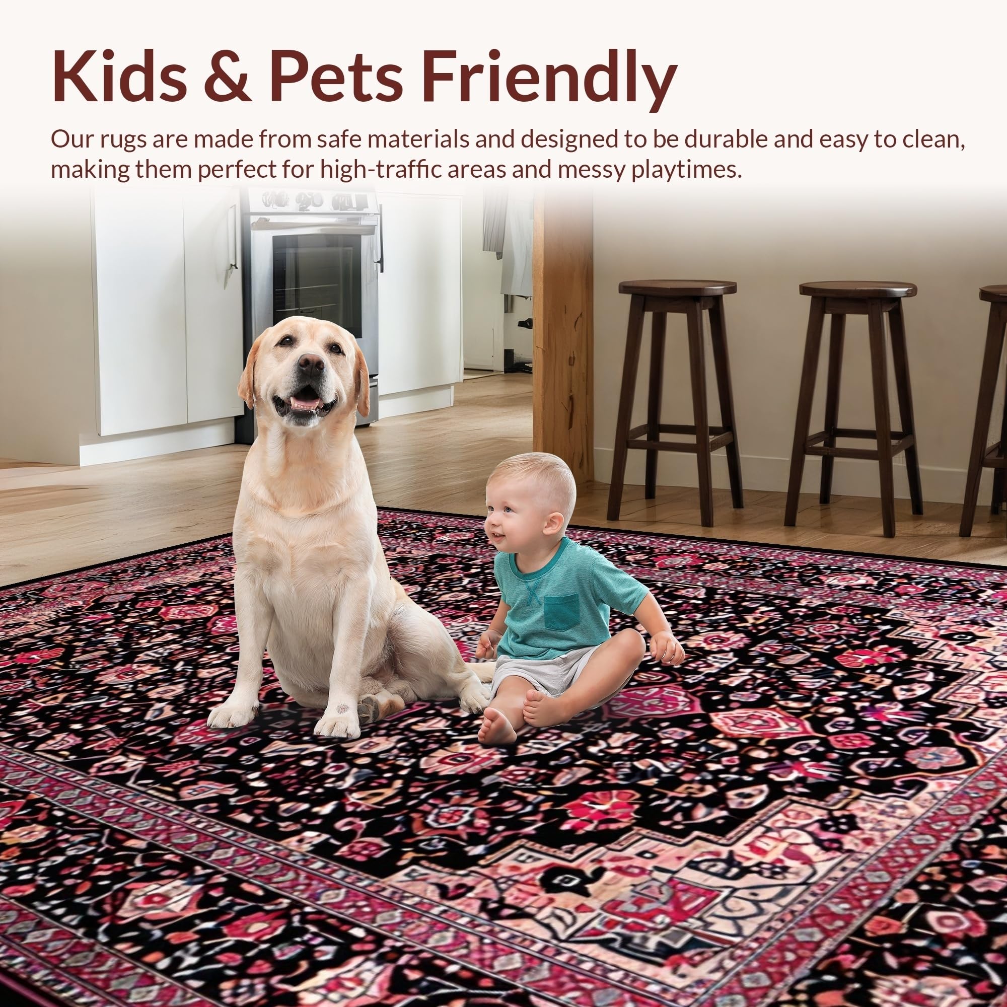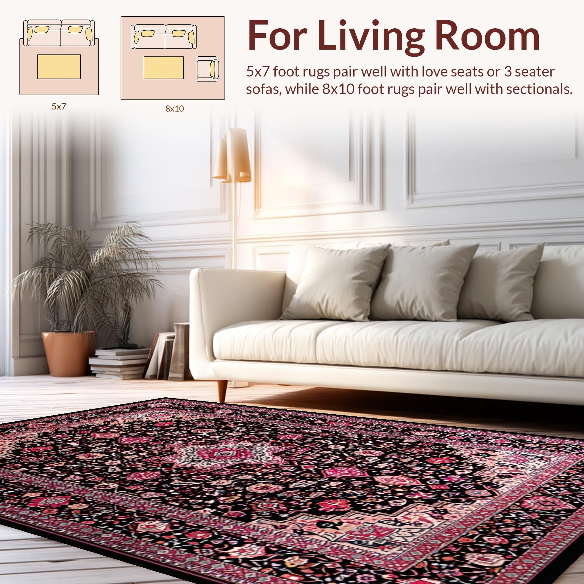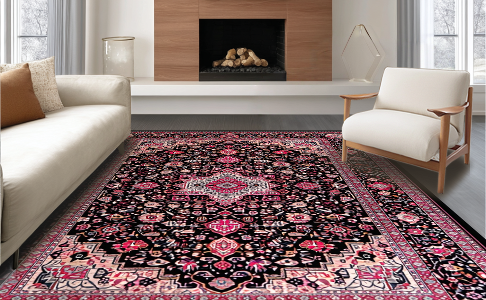 Ultra Soft Area Rug, Non Slip, Stain Resistant, Washable Area Rugs for Living Room, Bedroom, Vintage-Inspired Floral Medallion(Black) Overview: