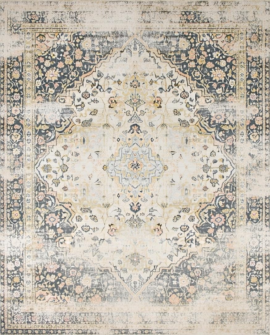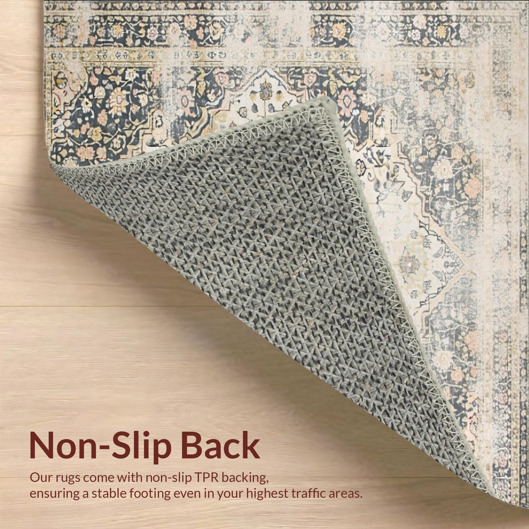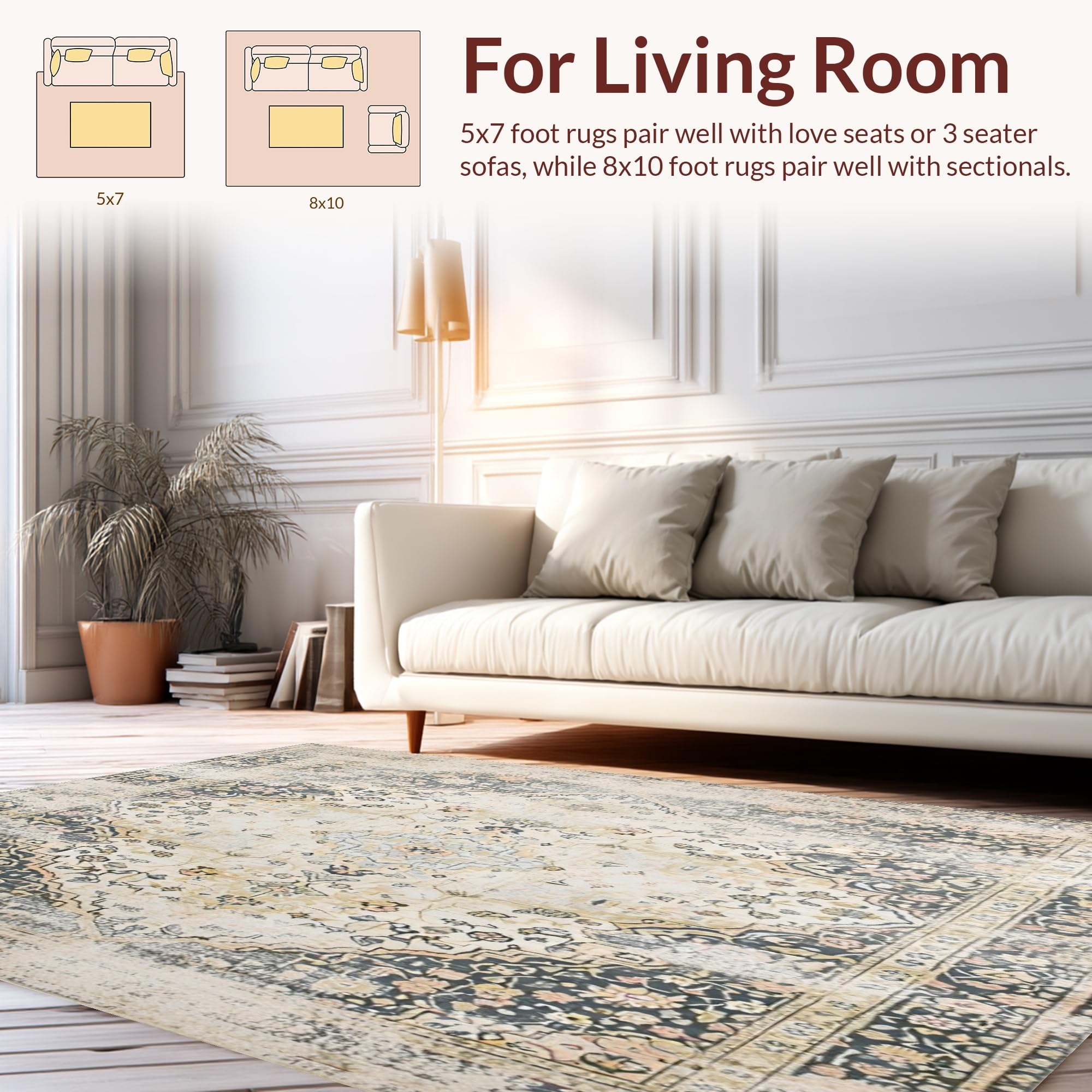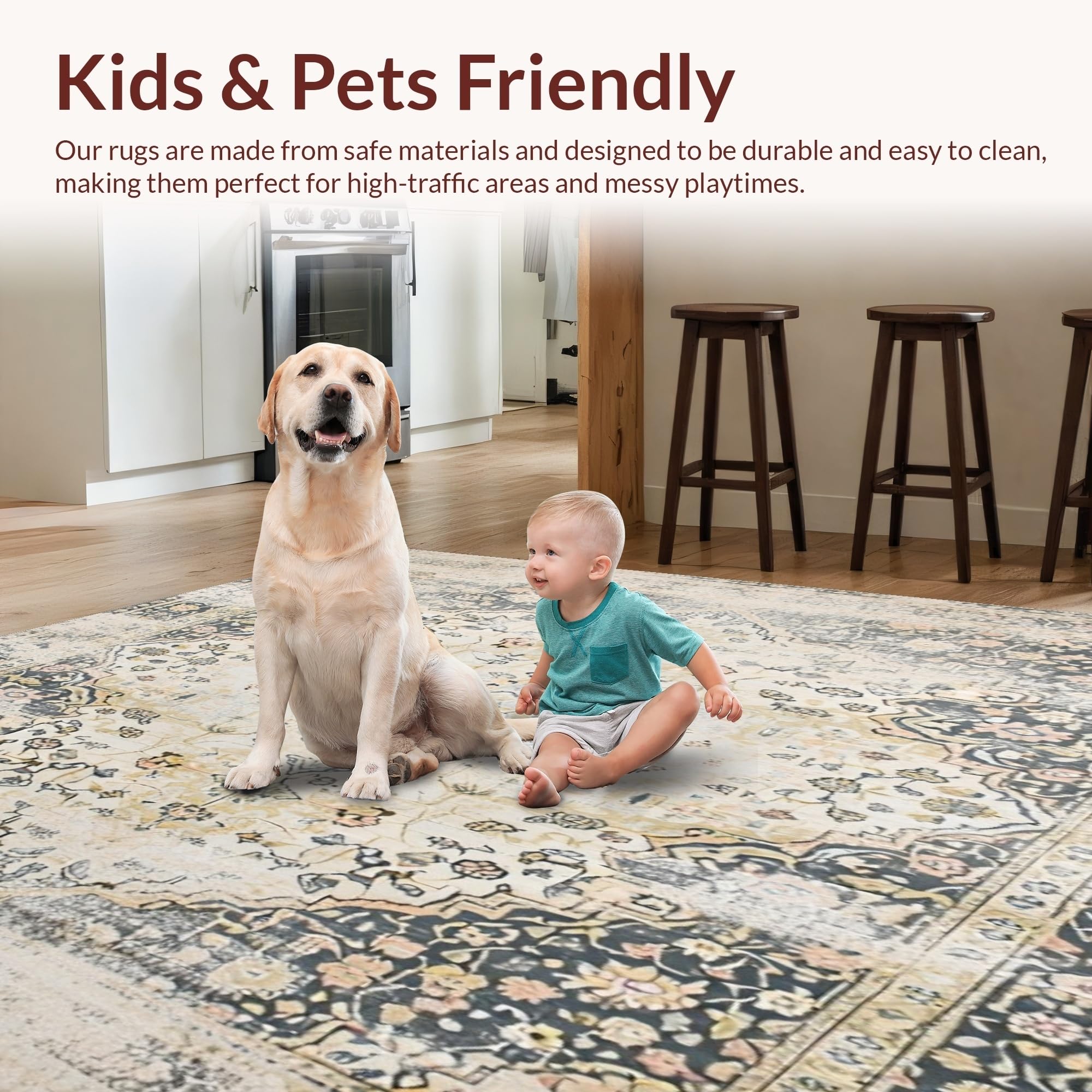 Ultra Soft Area Rug, Non Slip, Stain Resistant, Washable Area Rugs for Living Room, Bedroom, Vintage Inspired with Muted Beige and Dusty Grey Ornamental Motifs(Beige) Overview: