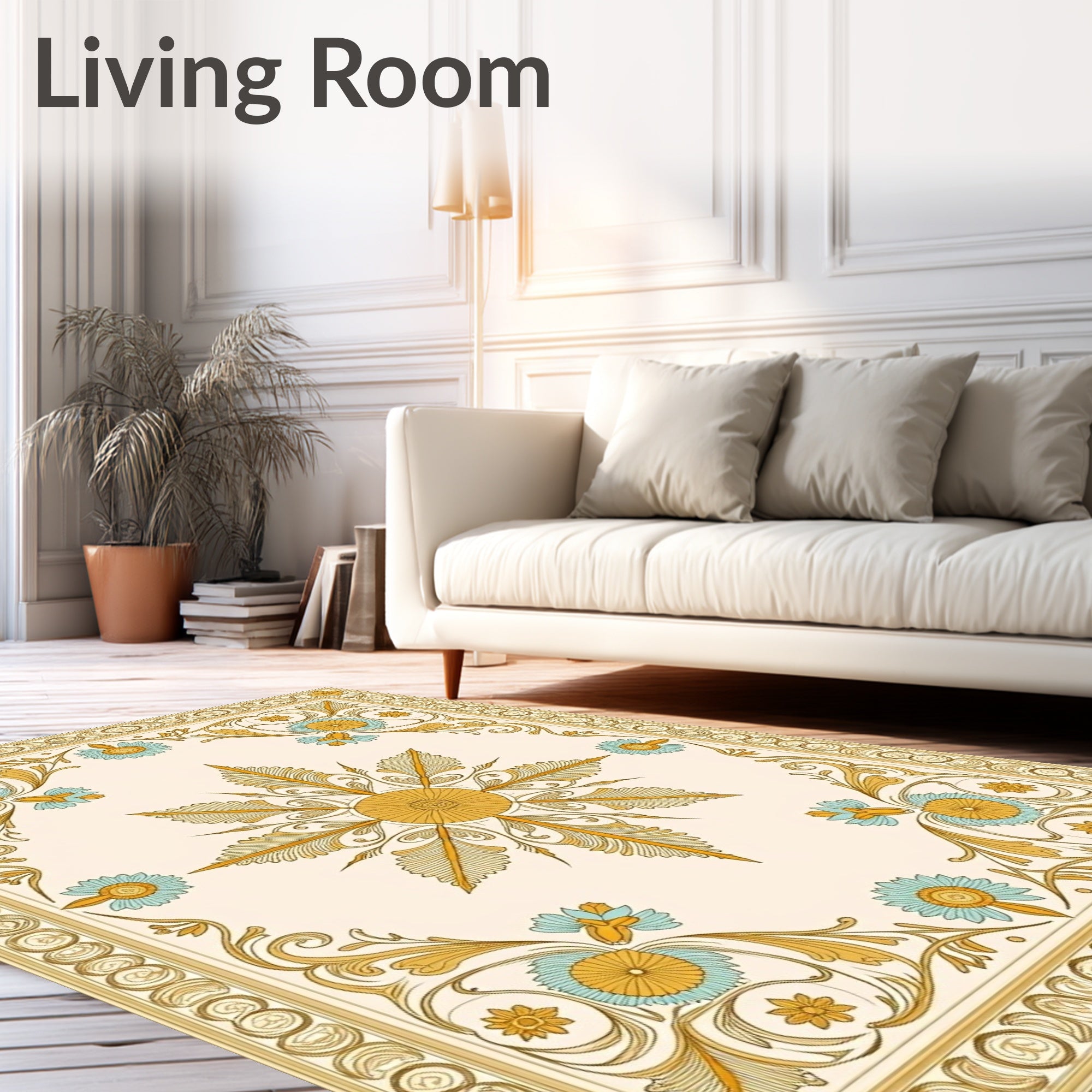Ultra Soft Area Rug, Non Slip, Stain Resistant, Washable Area Rugs for Living Room, Bedroom, Vintage Medallion Scrollwork with Faded Botanical Motifs and Art Nouveau Accents(Gold) Overview: