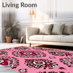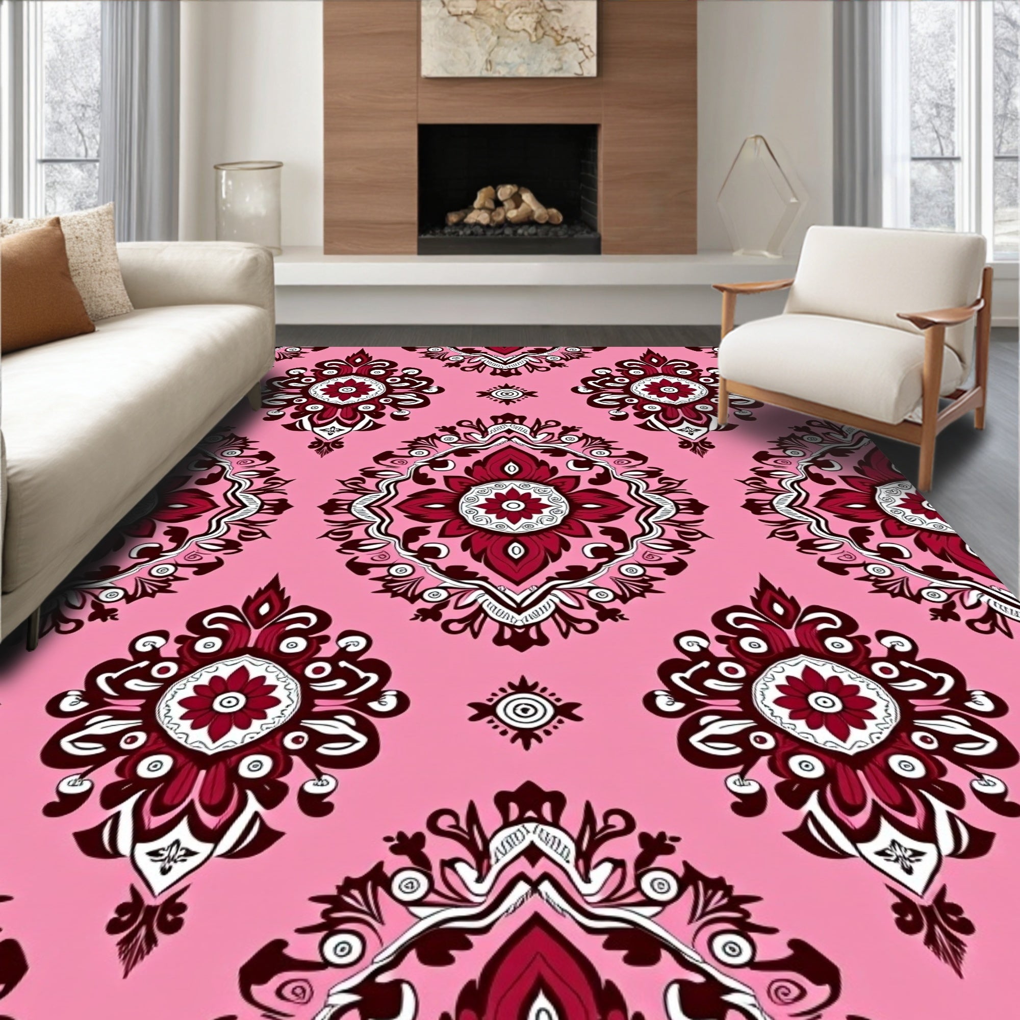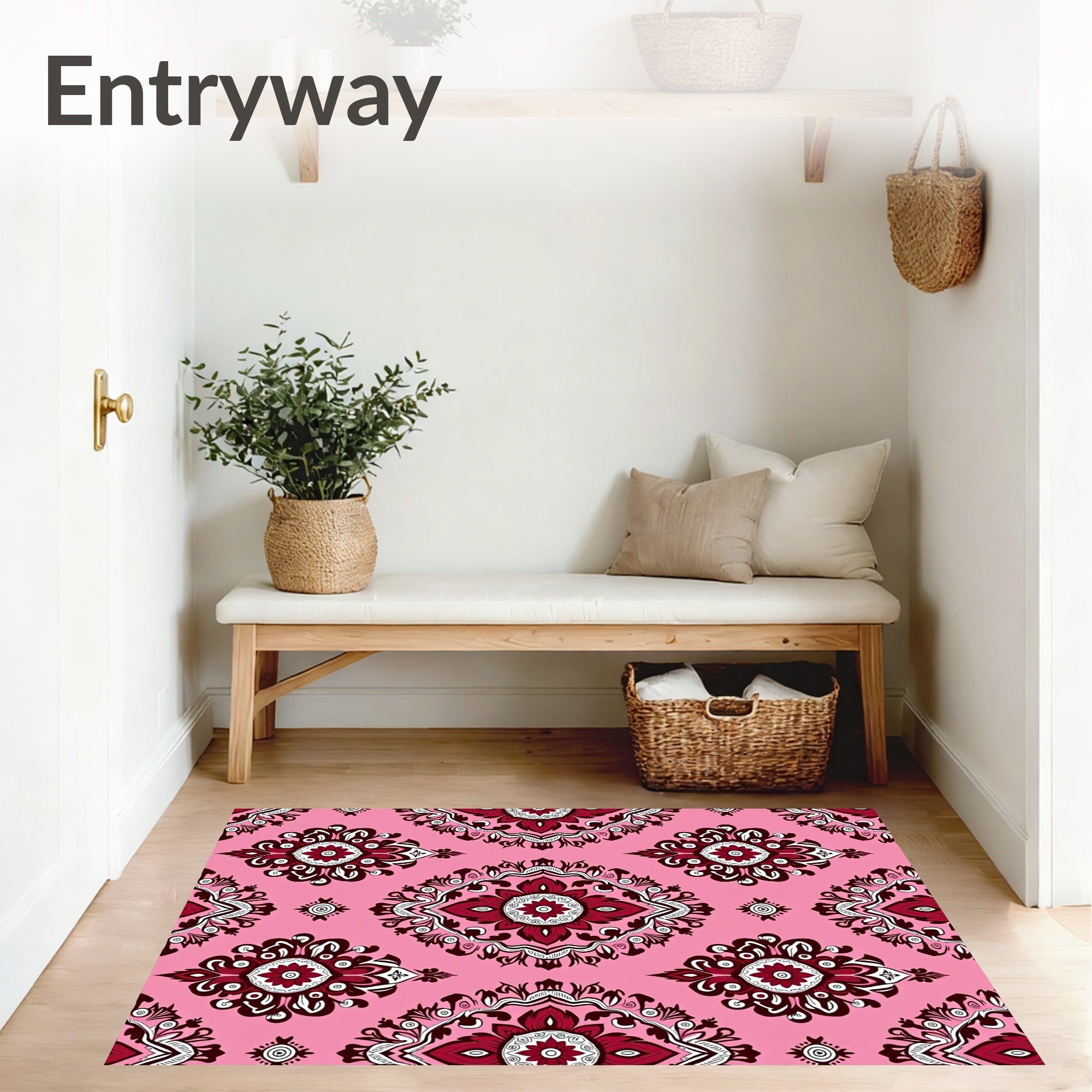 Ultra Soft Area Rug, Non Slip, Stain Resistant, Washable Area Rugs for Living Room, Bedroom, Vintage Starburst Damask with Ornate Berry Cluster Details(Pink) Overview:
