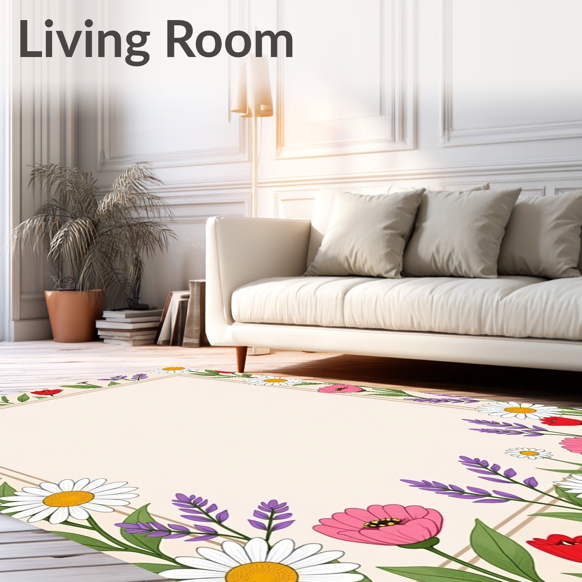 Infuse your home with the charm of a sun-drenched meadow using our Floral Daisy Tulip Border Area Rug. This design features a delicate cream and tan base framed by a vibrant botanical border of crisp white daisies, passionate red tulips, and soothing lavender sprigs. Perfect for high-traffic zones like the living room or entryway, this Durable floor covering is crafted to withstand the demands of daily life. The low pile height ensures a seamless fit under doors while remaining remarkably low-maintenance. Because accidents happen in a busy household, this rug is Machine Washable and certified with OEKO-TEX Standard 100, ensuring it is as safe for your family as it is stunning in your space.