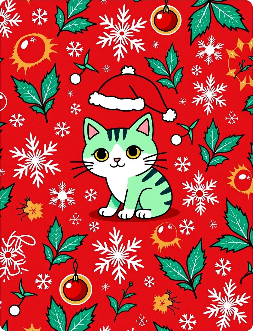 Whimsical Cat in Santa Hat with Snowflake and Holiday Ornament Design(Red)