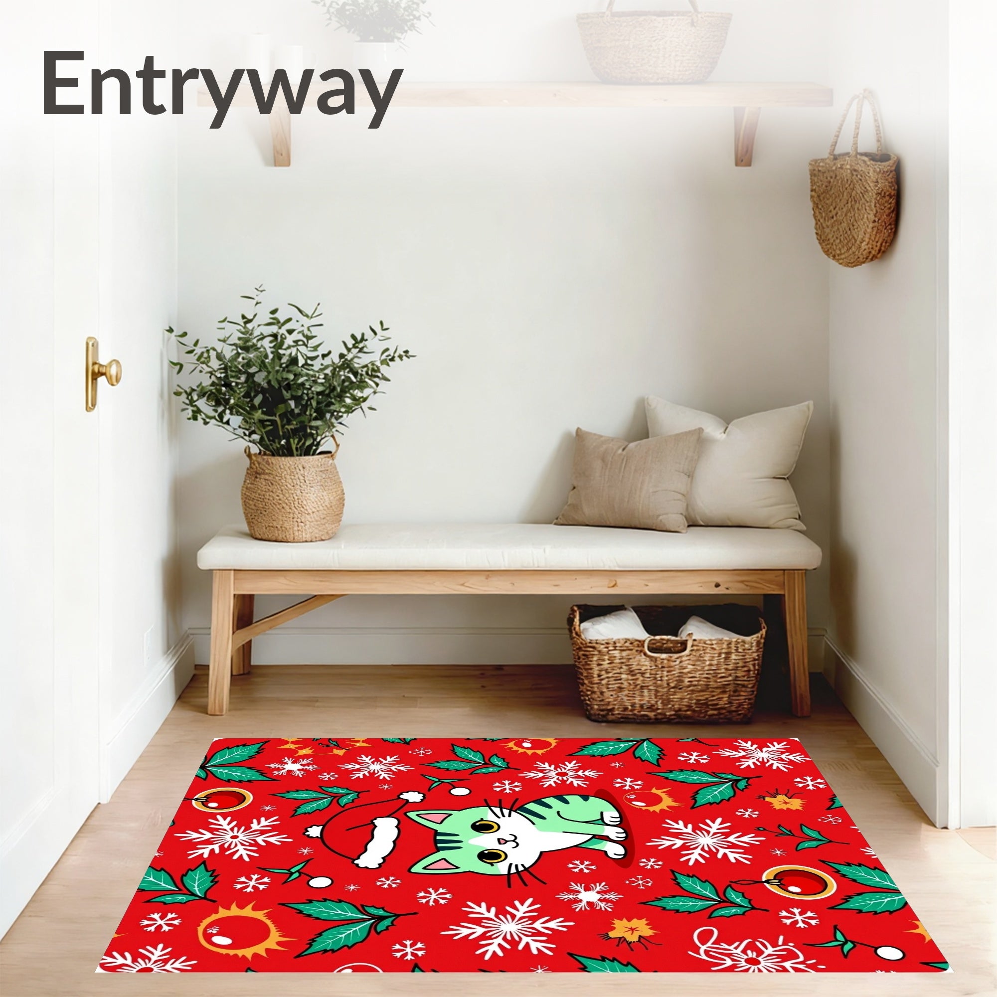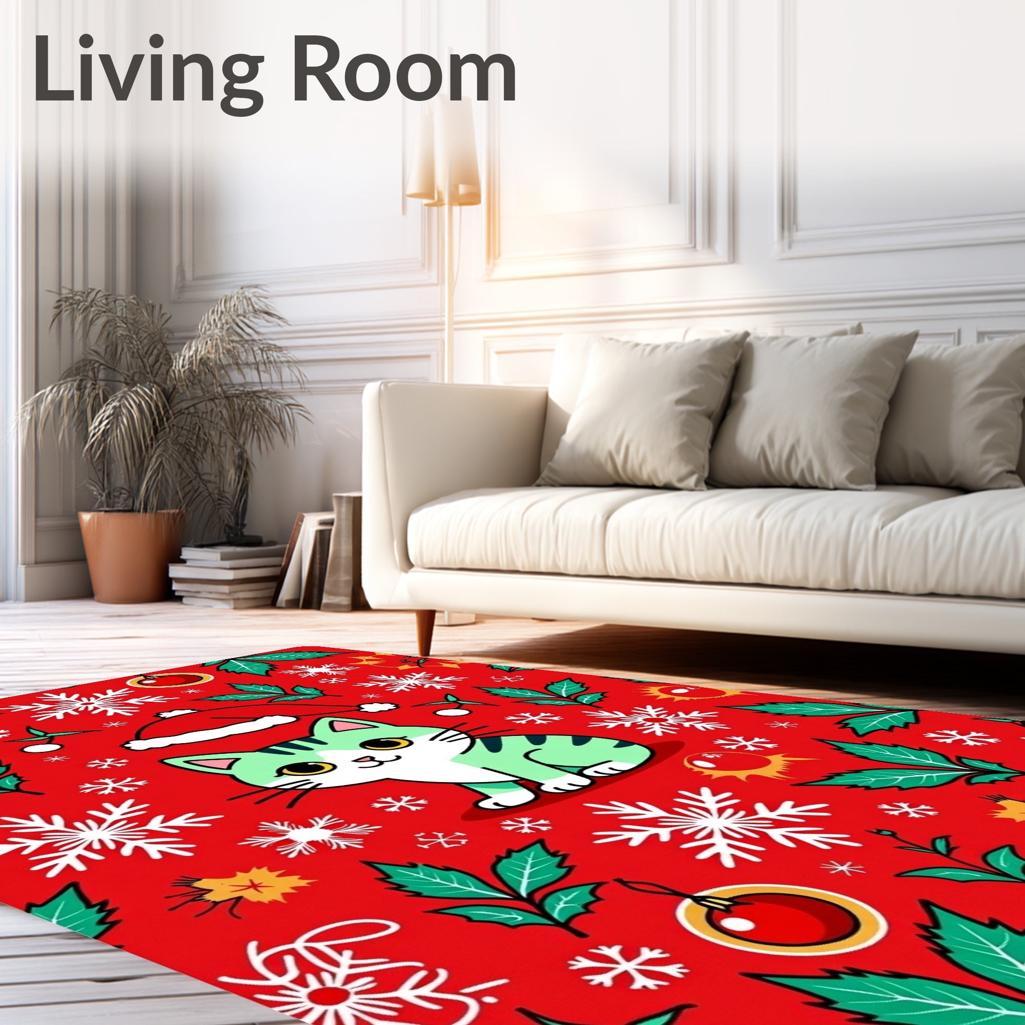 Ultra Soft Area Rug, Non Slip, Stain Resistant, Washable Area Rugs for Living Room, Bedroom, Whimsical Cat in Santa Hat with Snowflake and Holiday Ornament Design(Red) Overview: