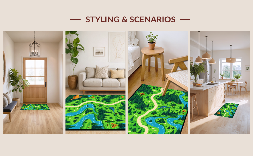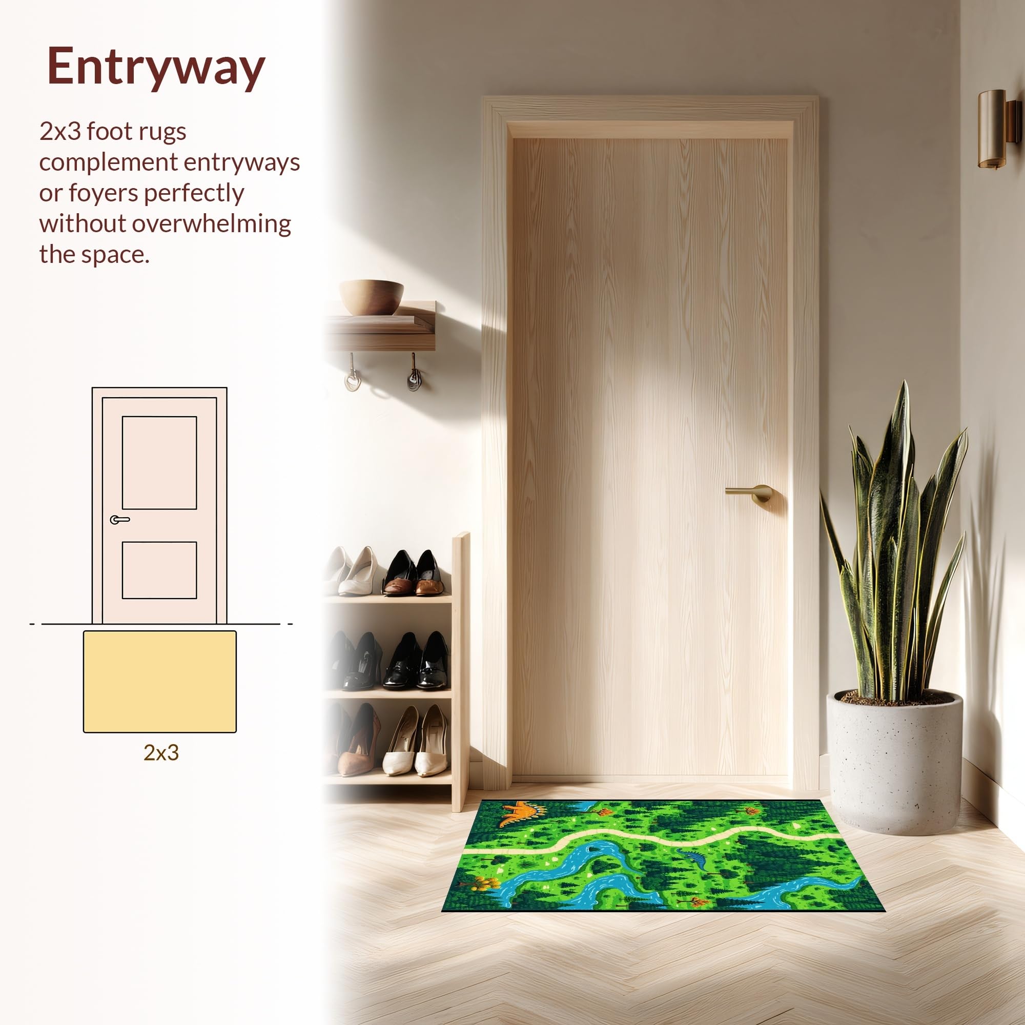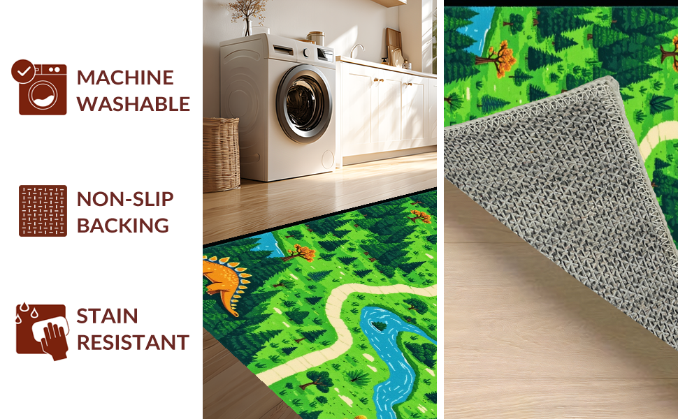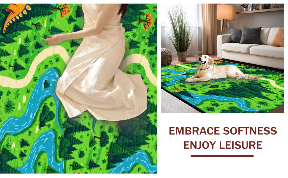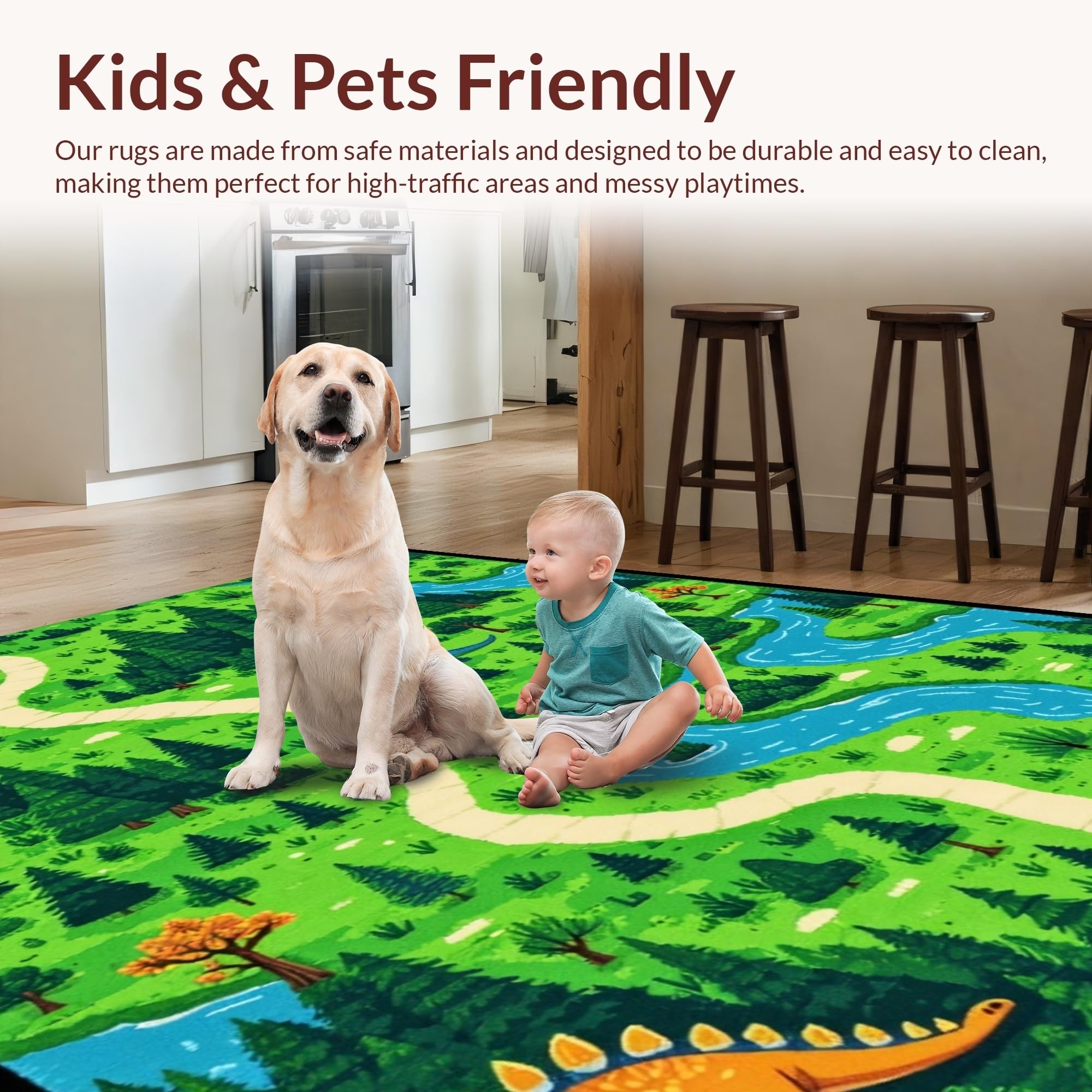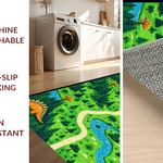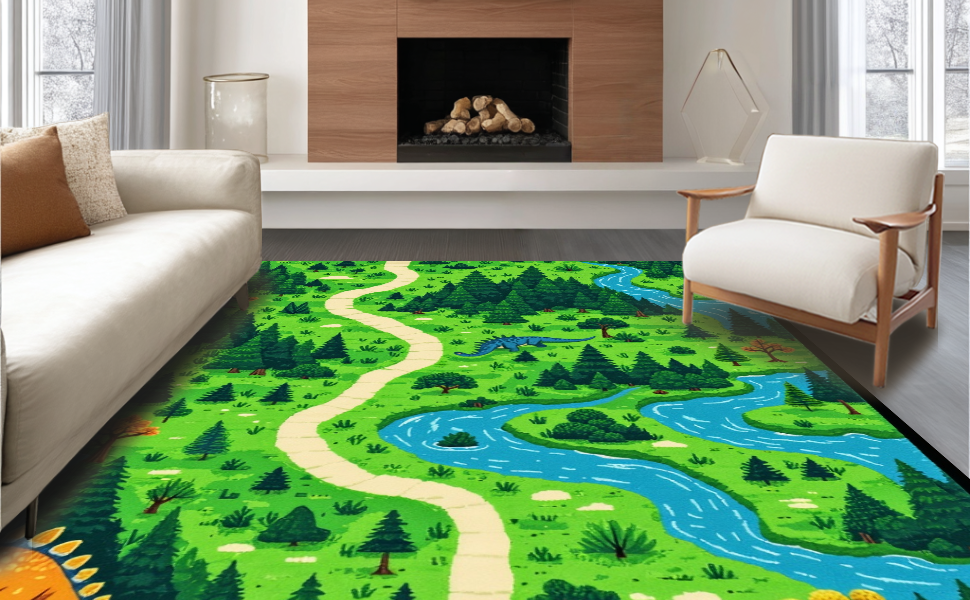 Ultra Soft Area Rug, Non Slip, Stain Resistant, Washable Area Rugs for Living Room, Bedroom, Whimsical Dino Adventure Landscape(Green) Overview:
