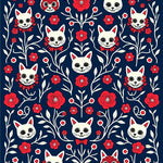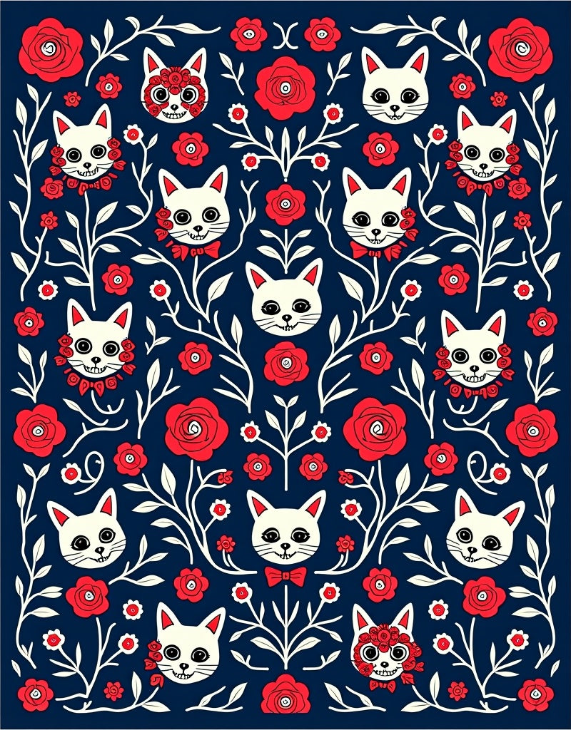 Whimsical Feline Skeletons Floral Masquerade Motif(Navy Blue)