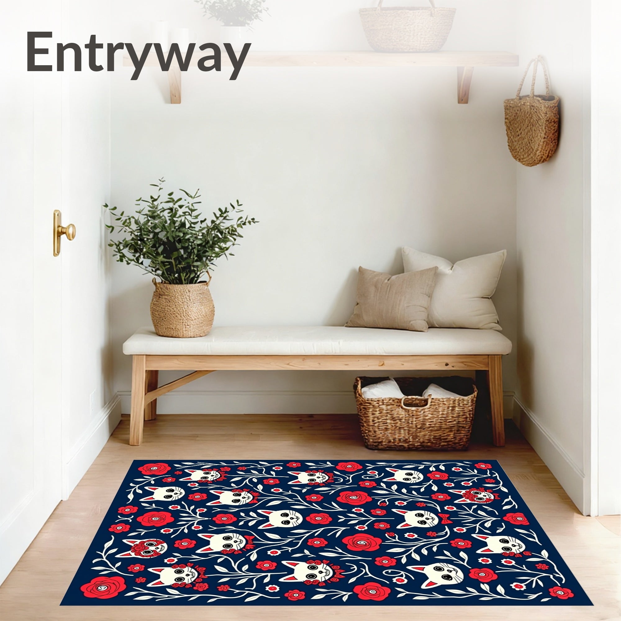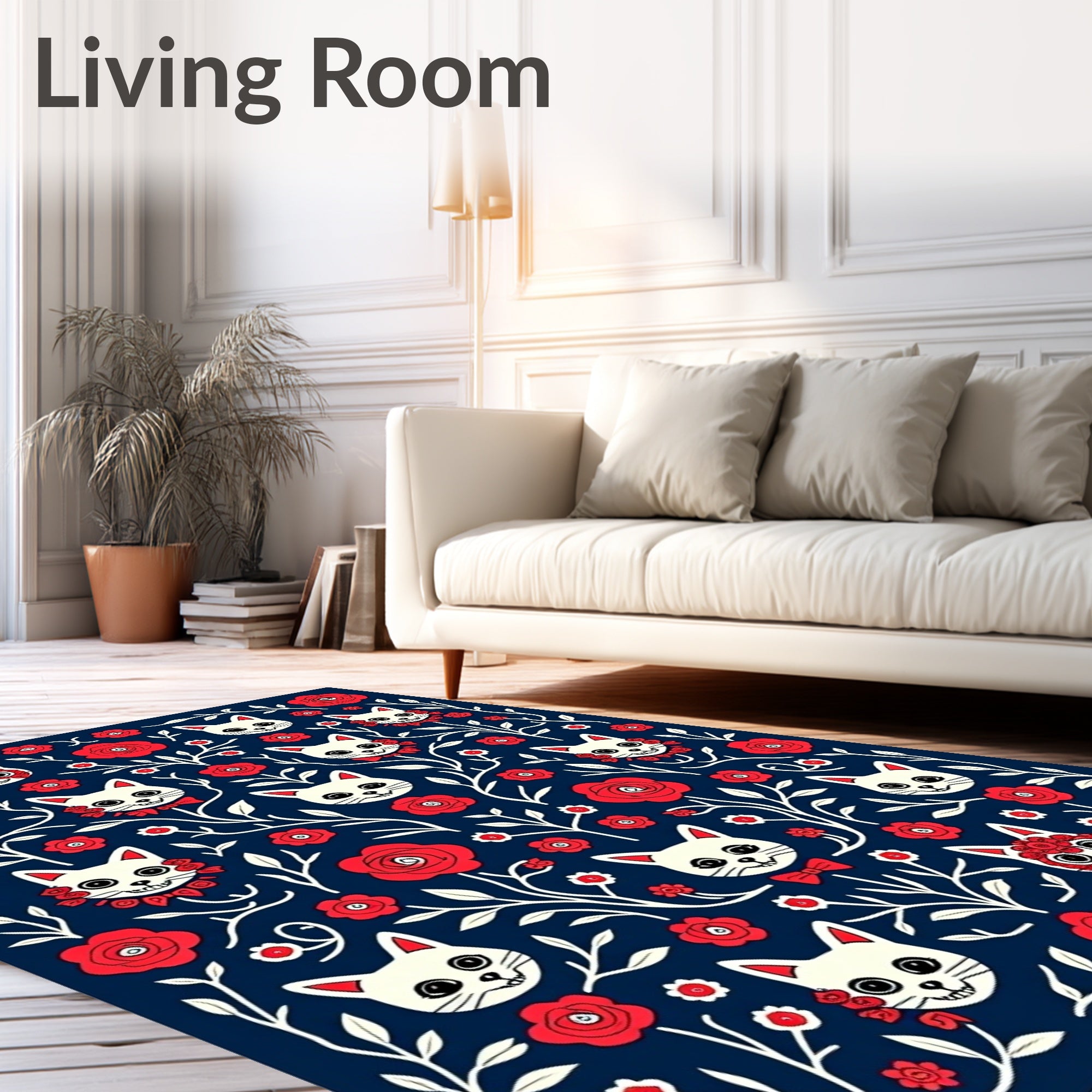 Ultra Soft Area Rug, Non Slip, Stain Resistant, Washable Area Rugs for Living Room, Bedroom, Whimsical Feline Skeletons Floral Masquerade Motif(Navy Blue) Overview: