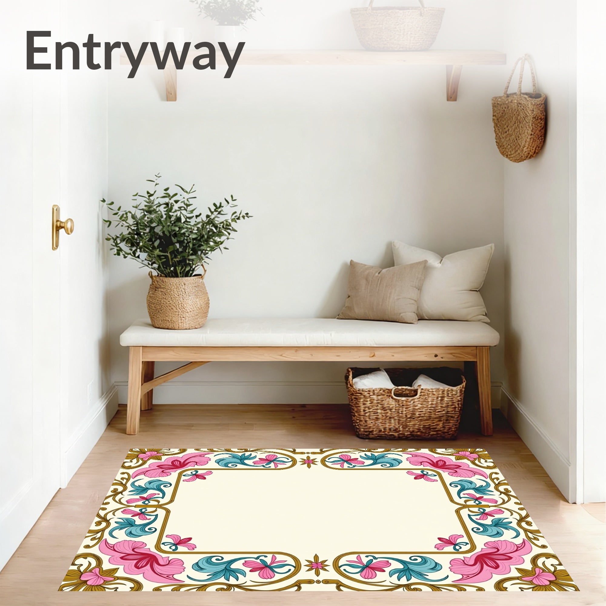 Ultra Soft Area Rug, Non Slip, Stain Resistant, Washable Area Rugs for Living Room, Bedroom, Whimsical Garden Blooms with Interlocking Rococo Filigree(Pink) Overview:
