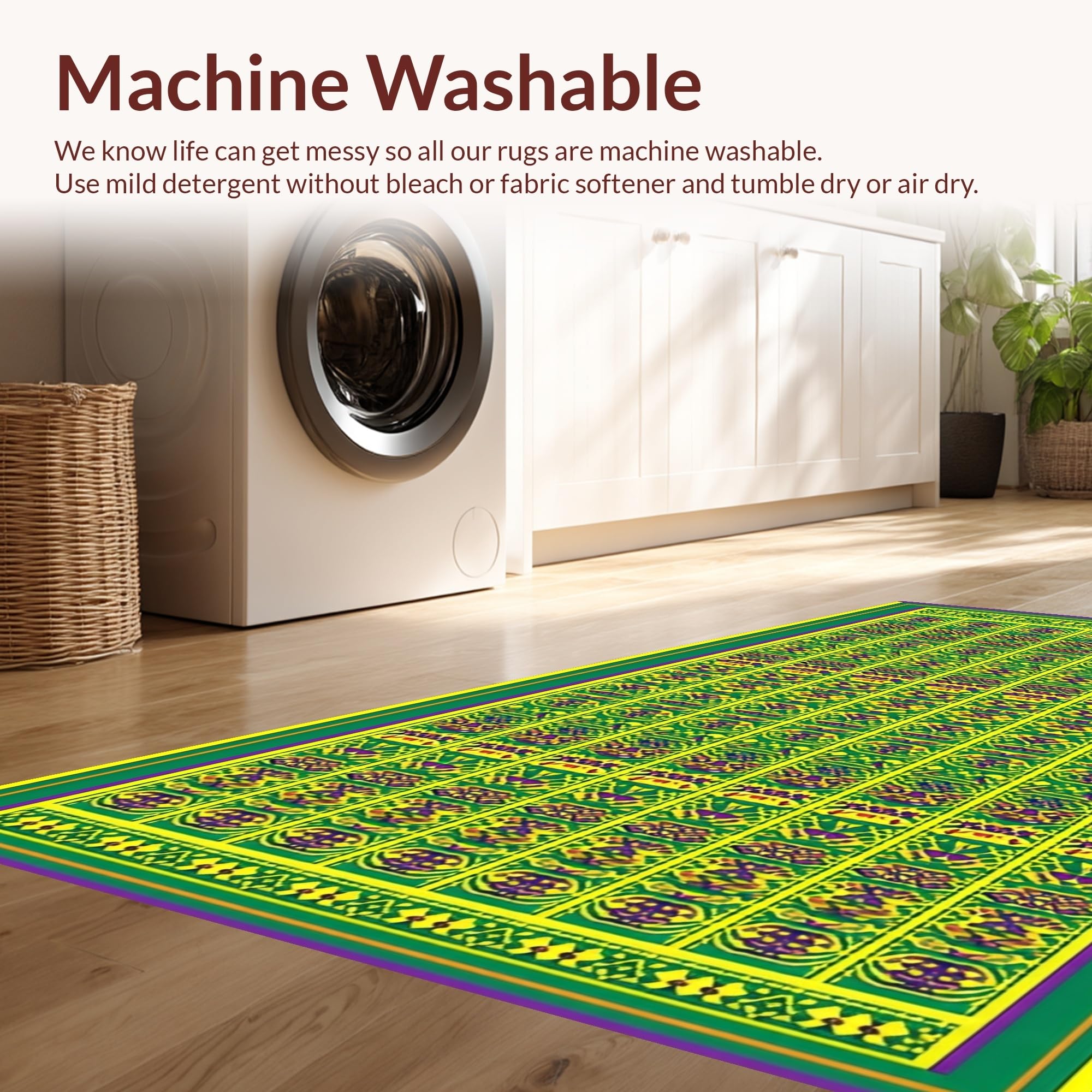 - Machine Washable: Our rugs can be easily thrown in the wash machine.