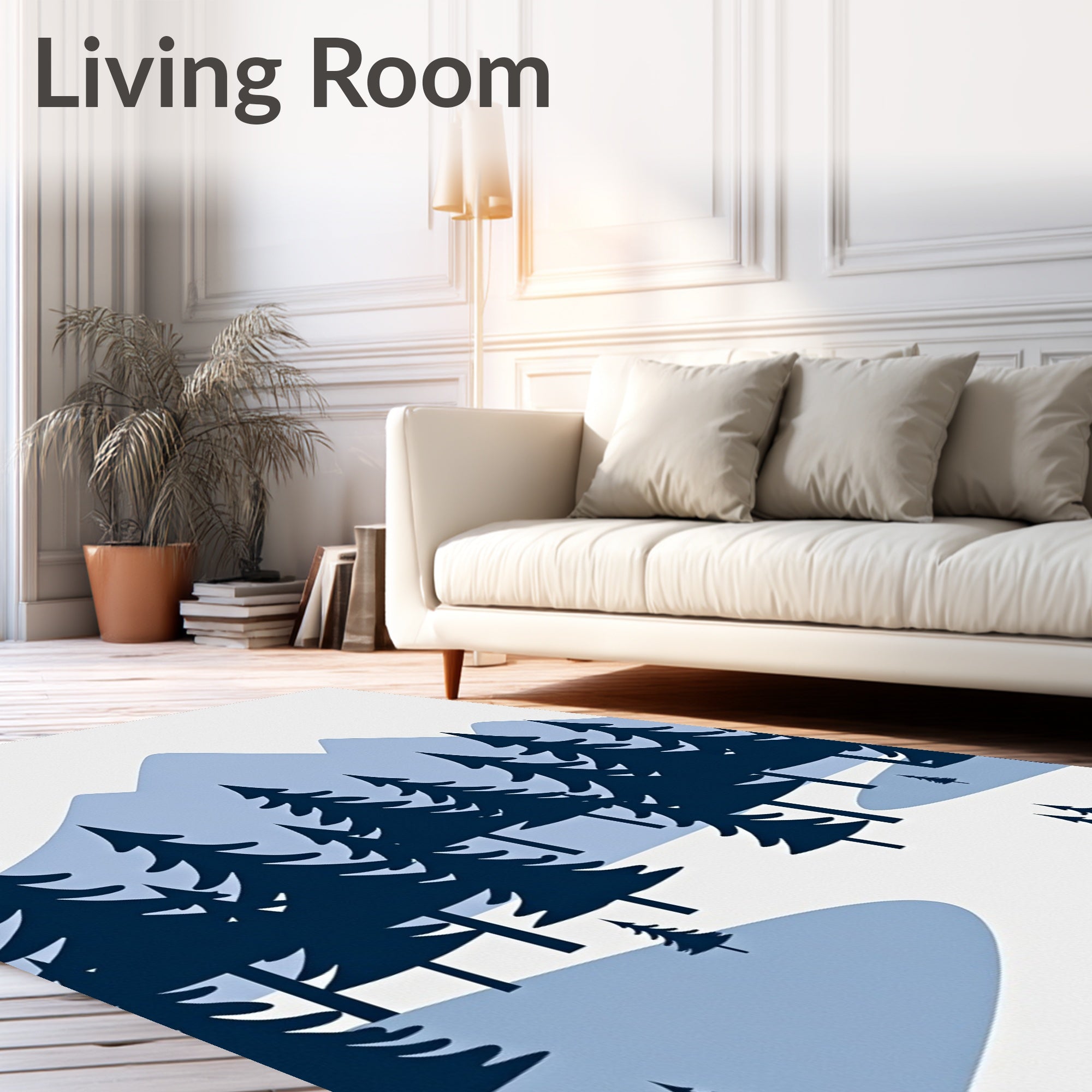 Ultra Soft Area Rug, Non Slip, Stain Resistant, Washable Area Rugs for Living Room, Bedroom, Winter Landscape Scene Doormat Pine Trees Mountain Design(Blue) Overview: