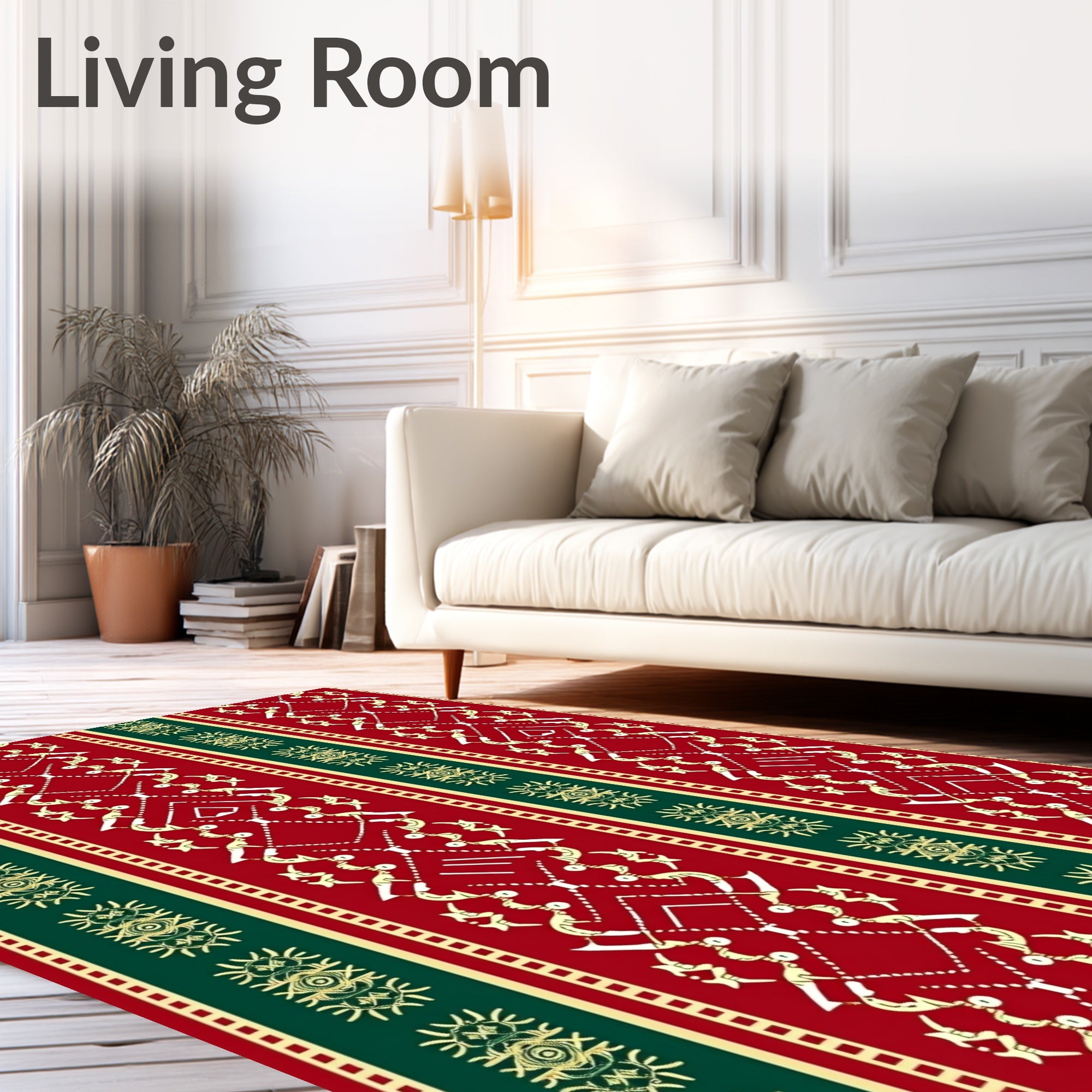 Ultra Soft Area Rug, Non Slip, Stain Resistant, Washable Area Rugs for Living Room, Bedroom, Winterberry Stripe Interlocking Festive Holiday Style(Red) Overview: