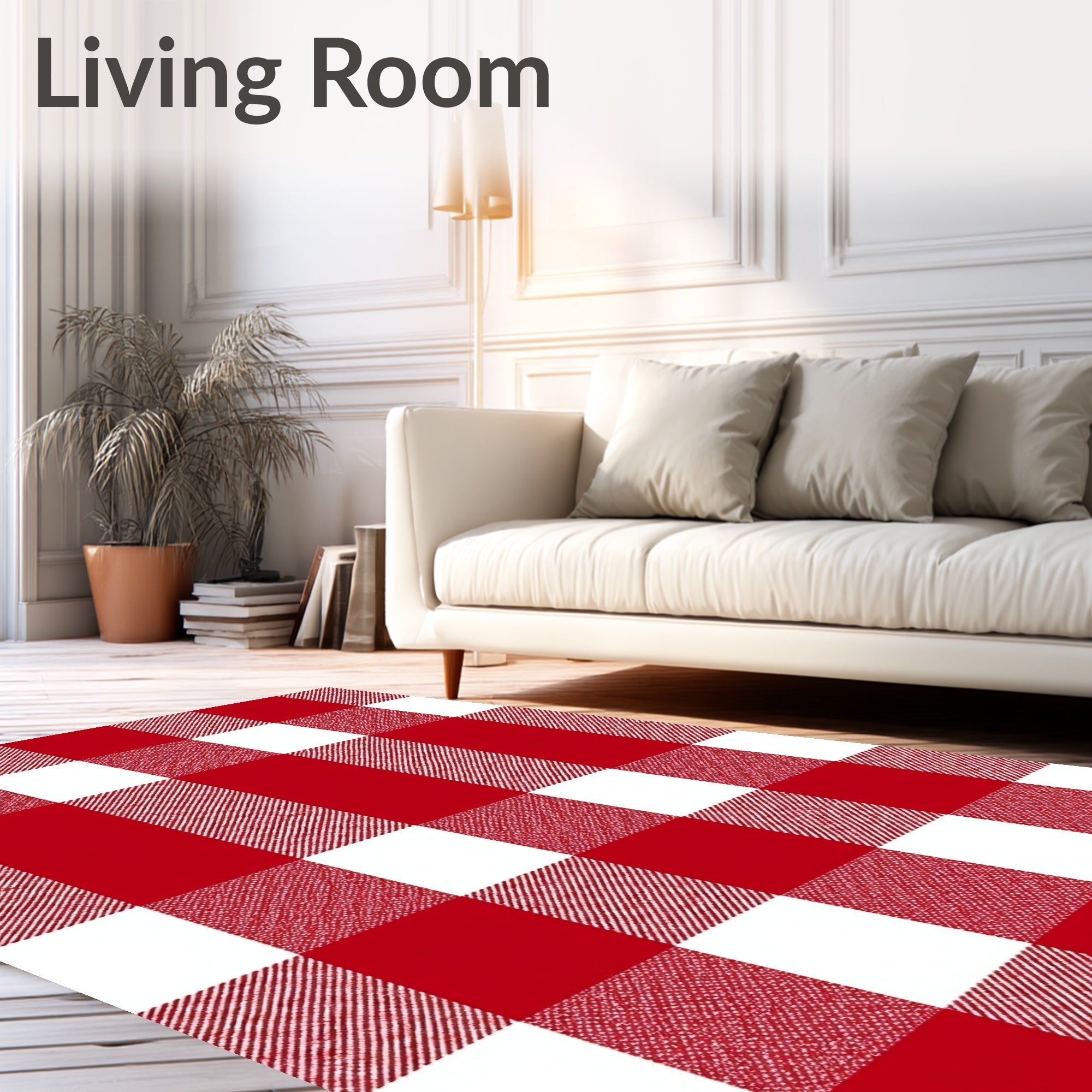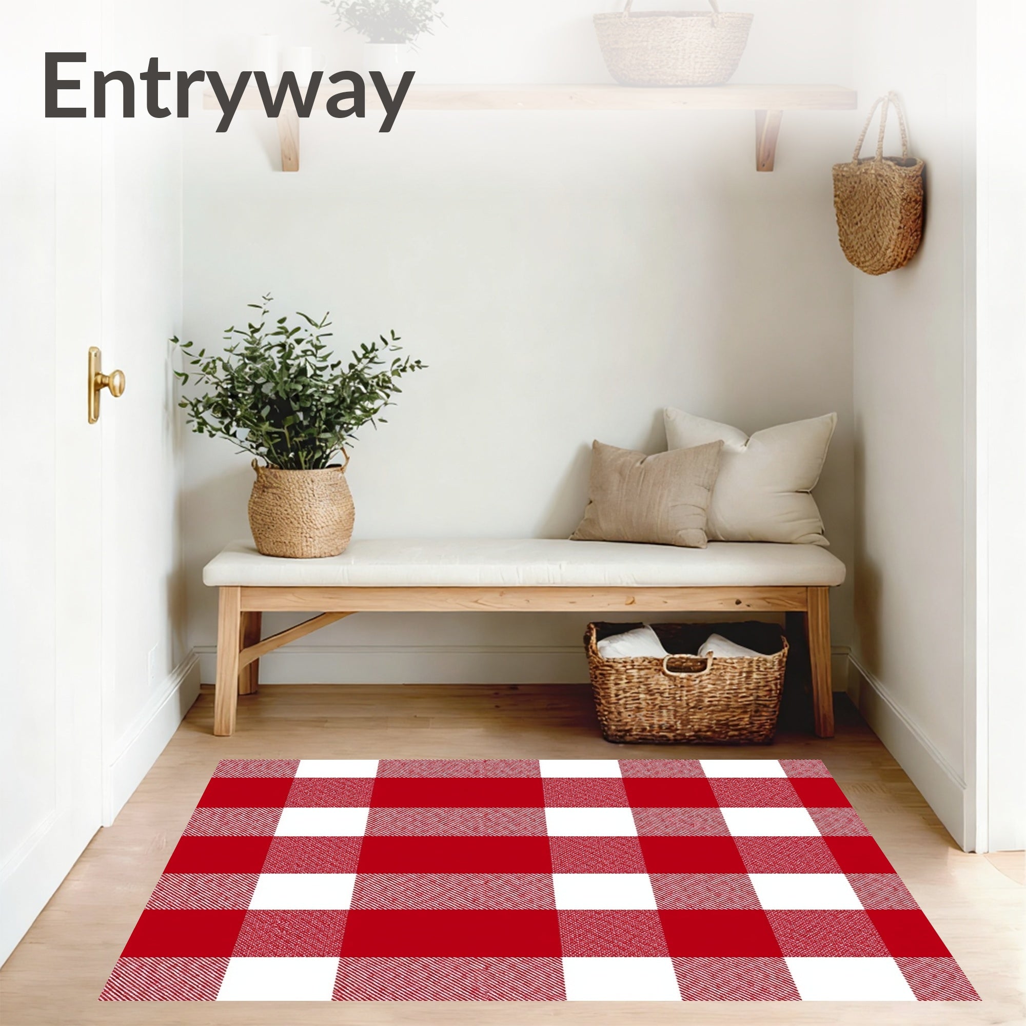 Ultra Soft Area Rug, Non Slip, Stain Resistant, Washable Area Rugs for Living Room, Bedroom, Yuletide Buffalo Check Doormat with Traditional Cabin Style Motifs(Red) Overview: