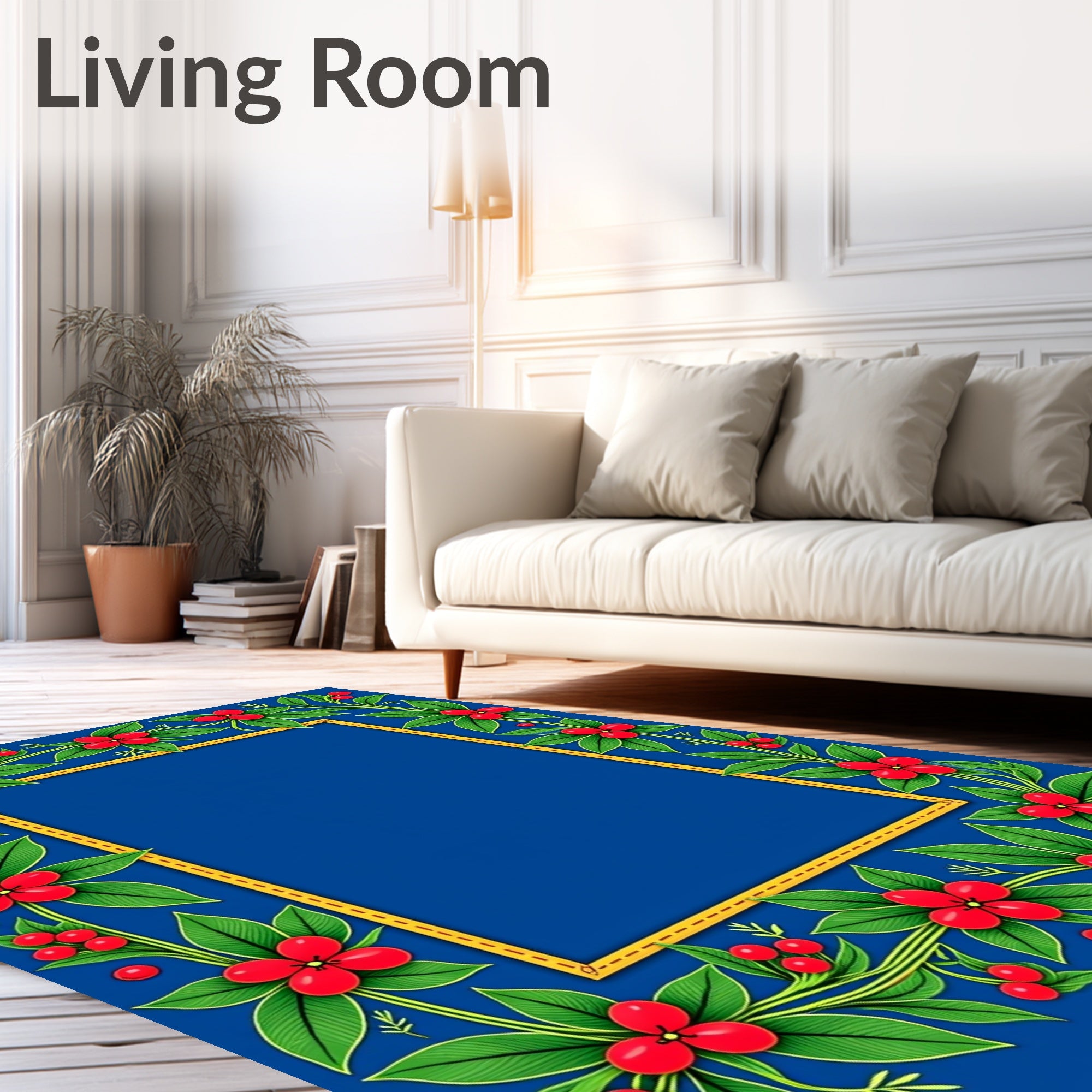 Ultra Soft Area Rug, Non Slip, Stain Resistant, Washable Area Rugs for Living Room, Bedroom, Yuletide Holly Berry Vine Border with Botanical Leaf Details(Blue) Overview: