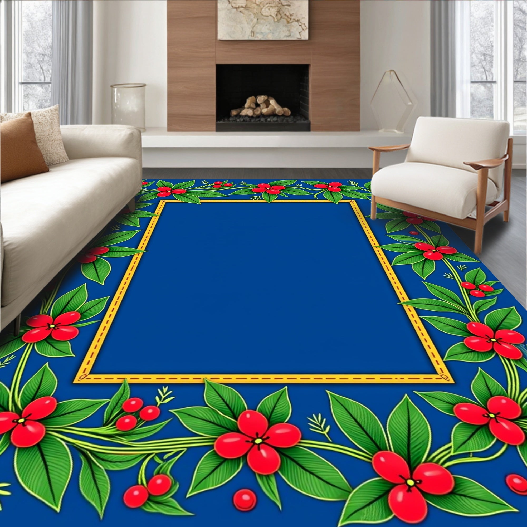 Flatwoven High Traffic Area Rug, Yuletide Holly Berry Vine Border with Botanical Leaf Details, Non Slip, Stain Resistant, Washable Area Rugs for Living Room, Bedroom (Blue) Overview: