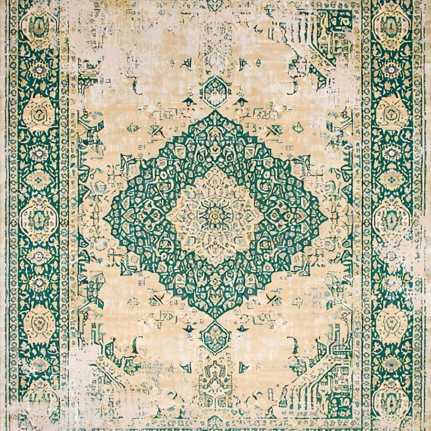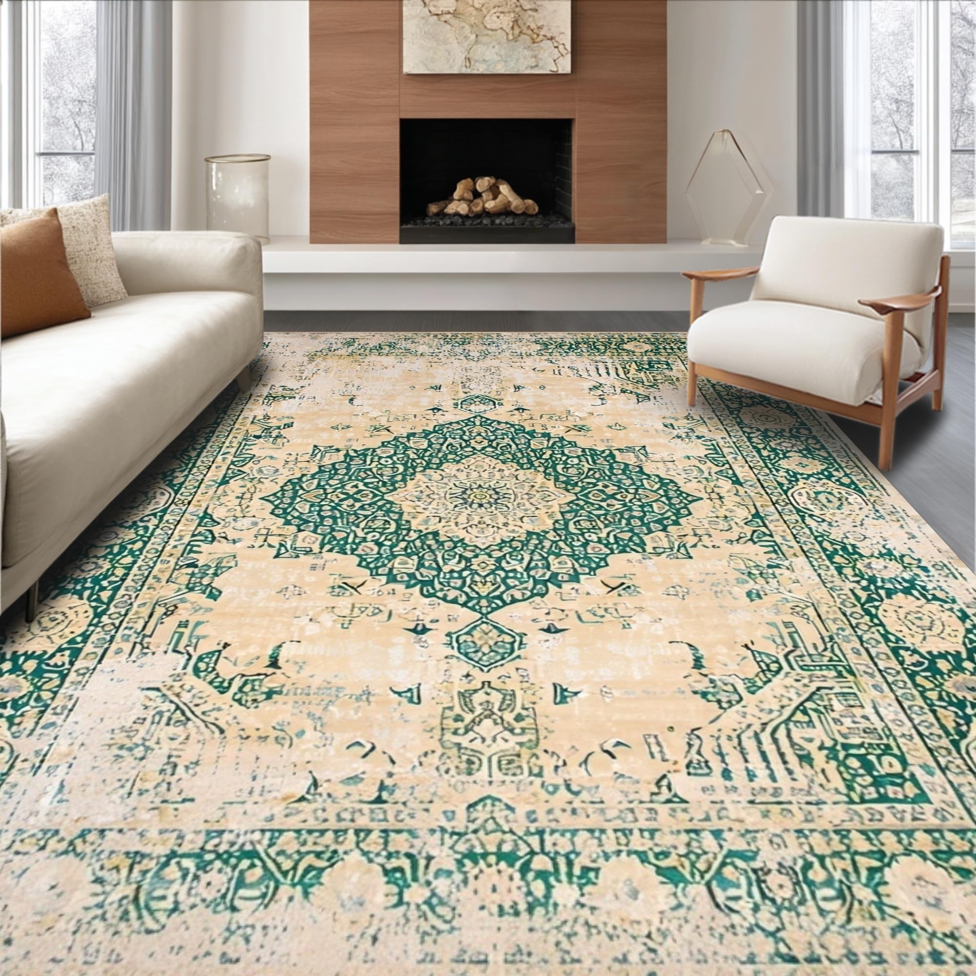 Beige Green Distressed Medallion Durable Non Shedding(Beige)