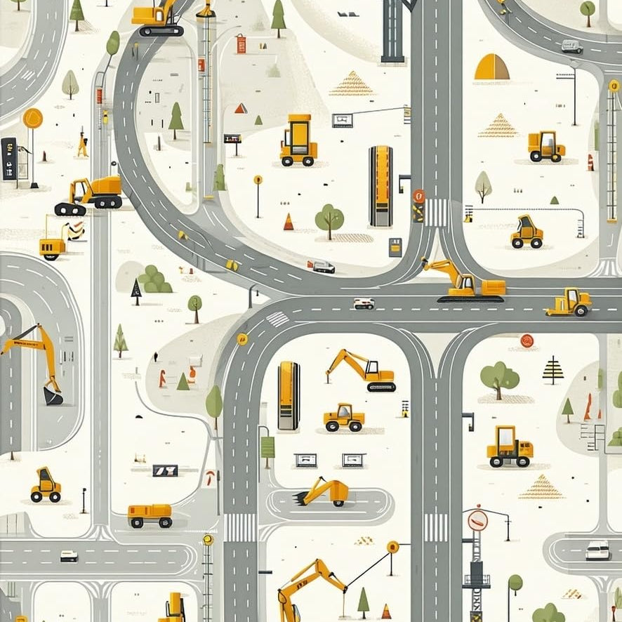 Machine Washable Rug with Cream Gray Road Map and Construction Vehicle Art(Beige)