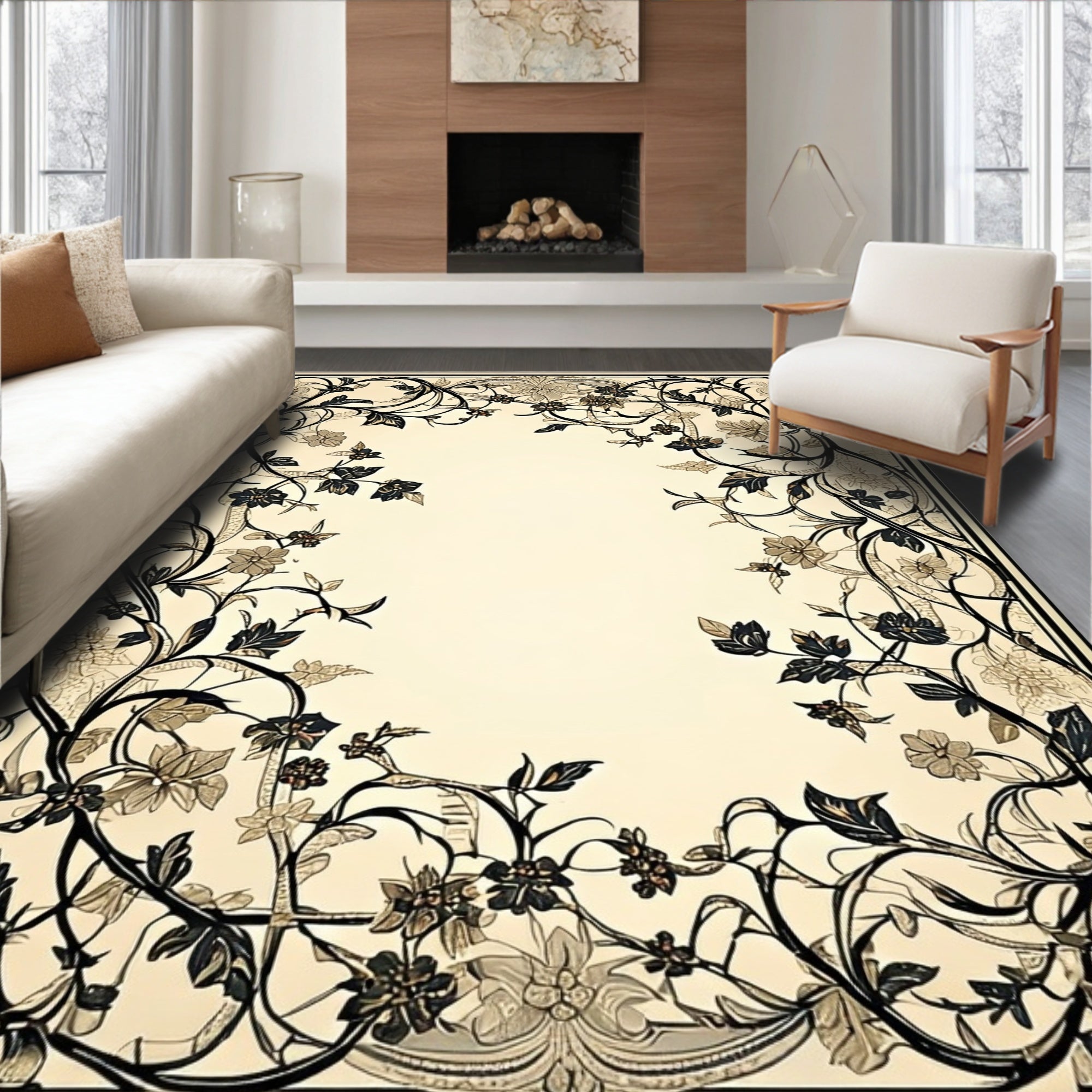Vintage Inspired Low Pile with Ornate Black and Beige Floral Filigree(Beige)