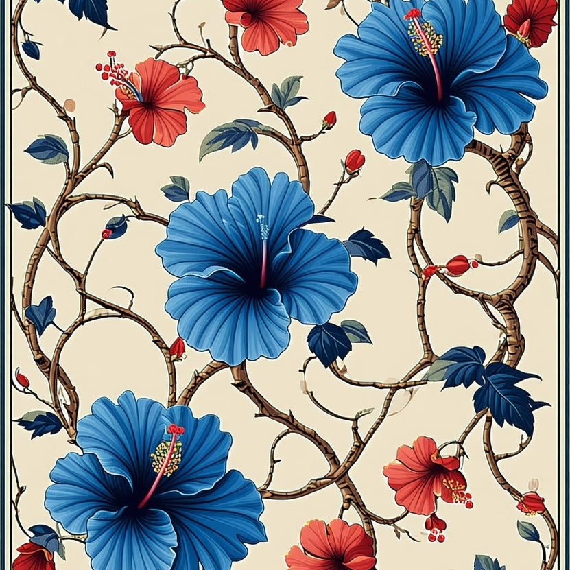 Hibiscus Garden Symphony with Modern Botanical Blooms and Artistic Flourish(Beige)
