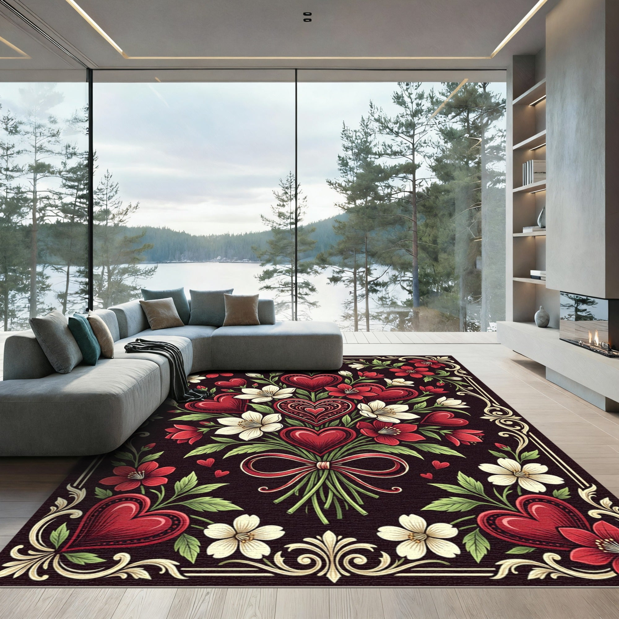 Red Heart Floral Bouquet Arrangement Rug