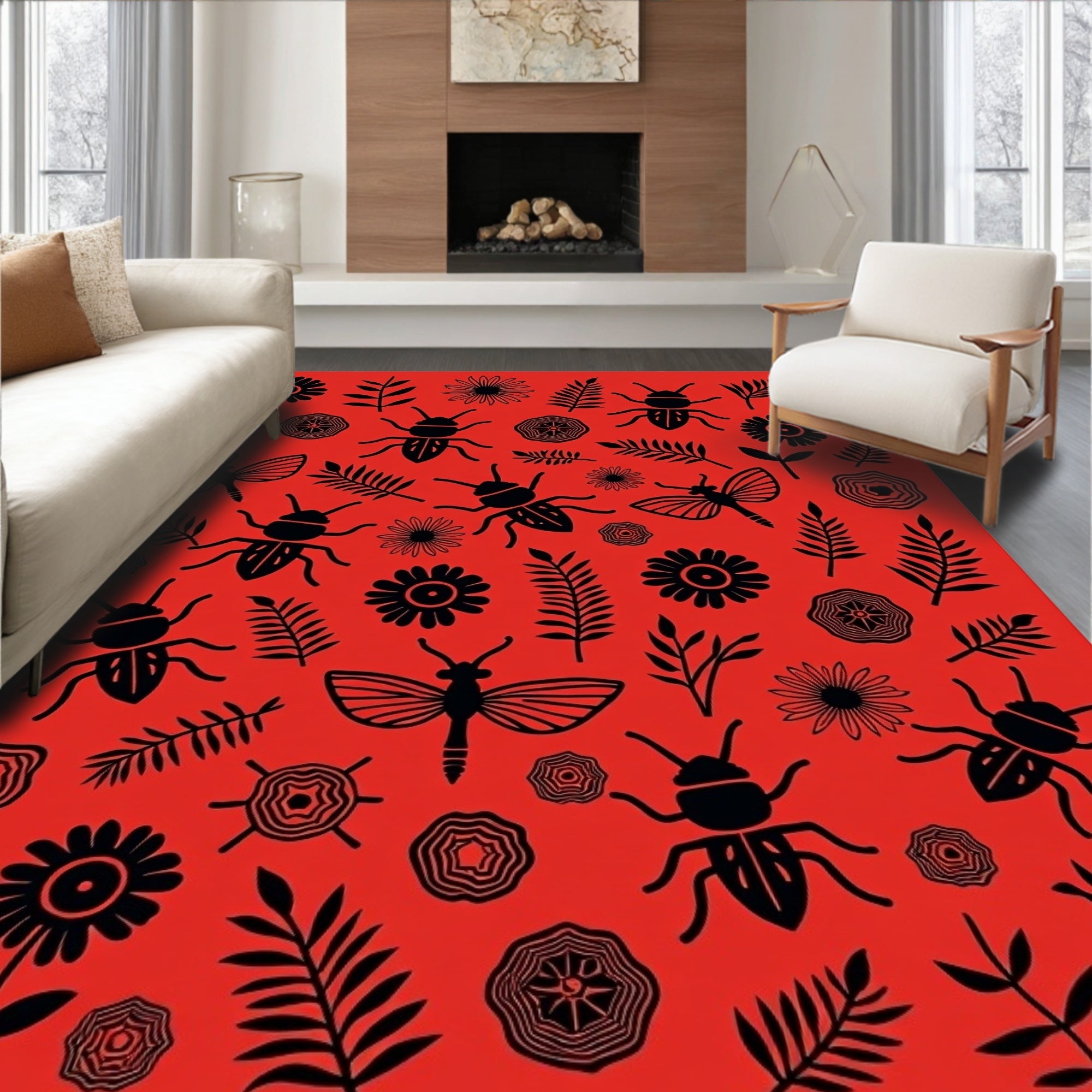 Whimsical Insect Meadow Tapestry with Floral Accents (Red)