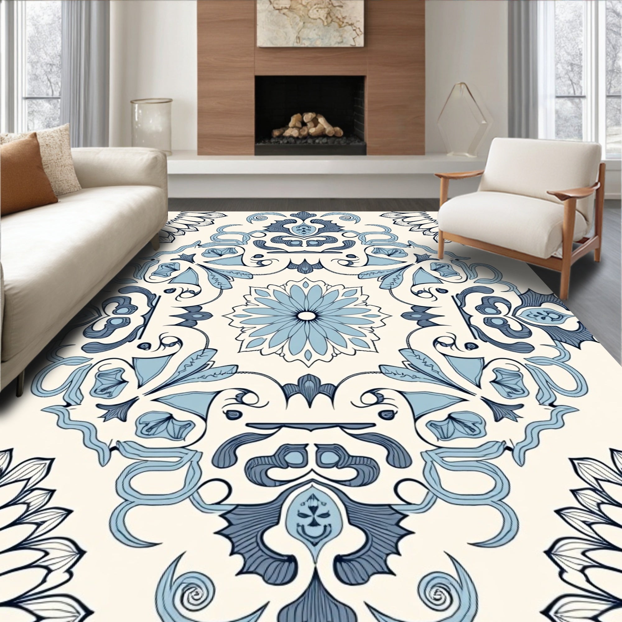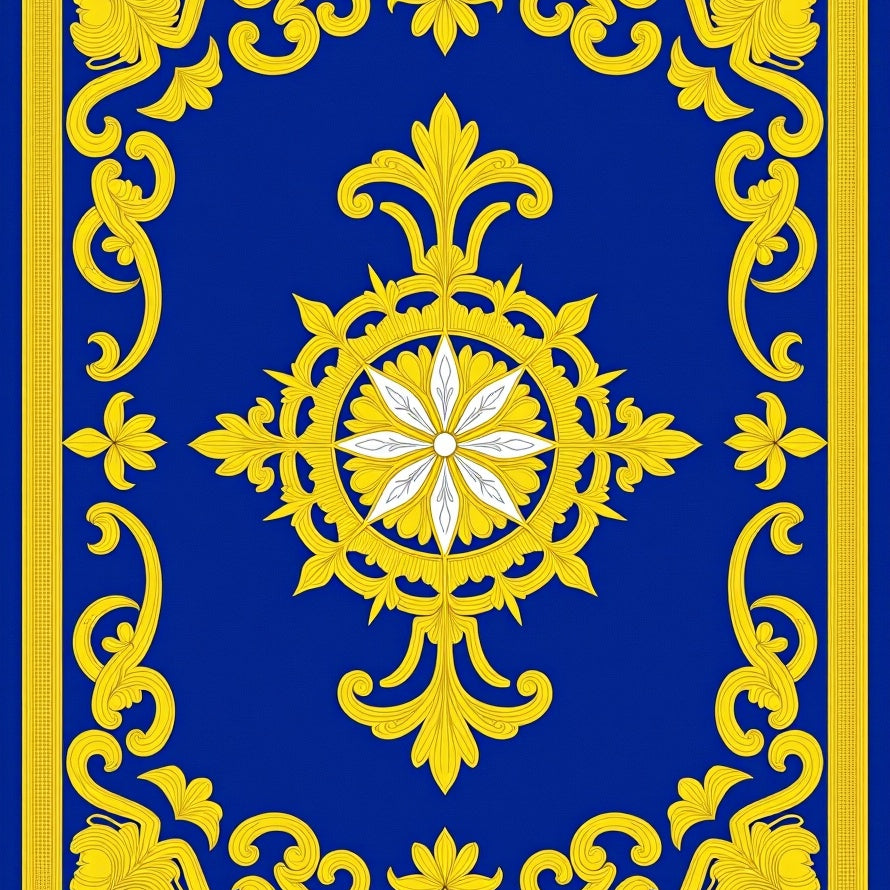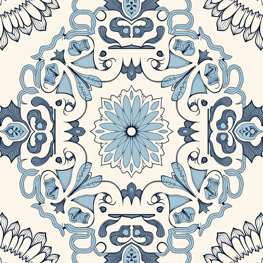 Ornate Floral Medallion Motif with Curved Scrollwork Details(Blue)
