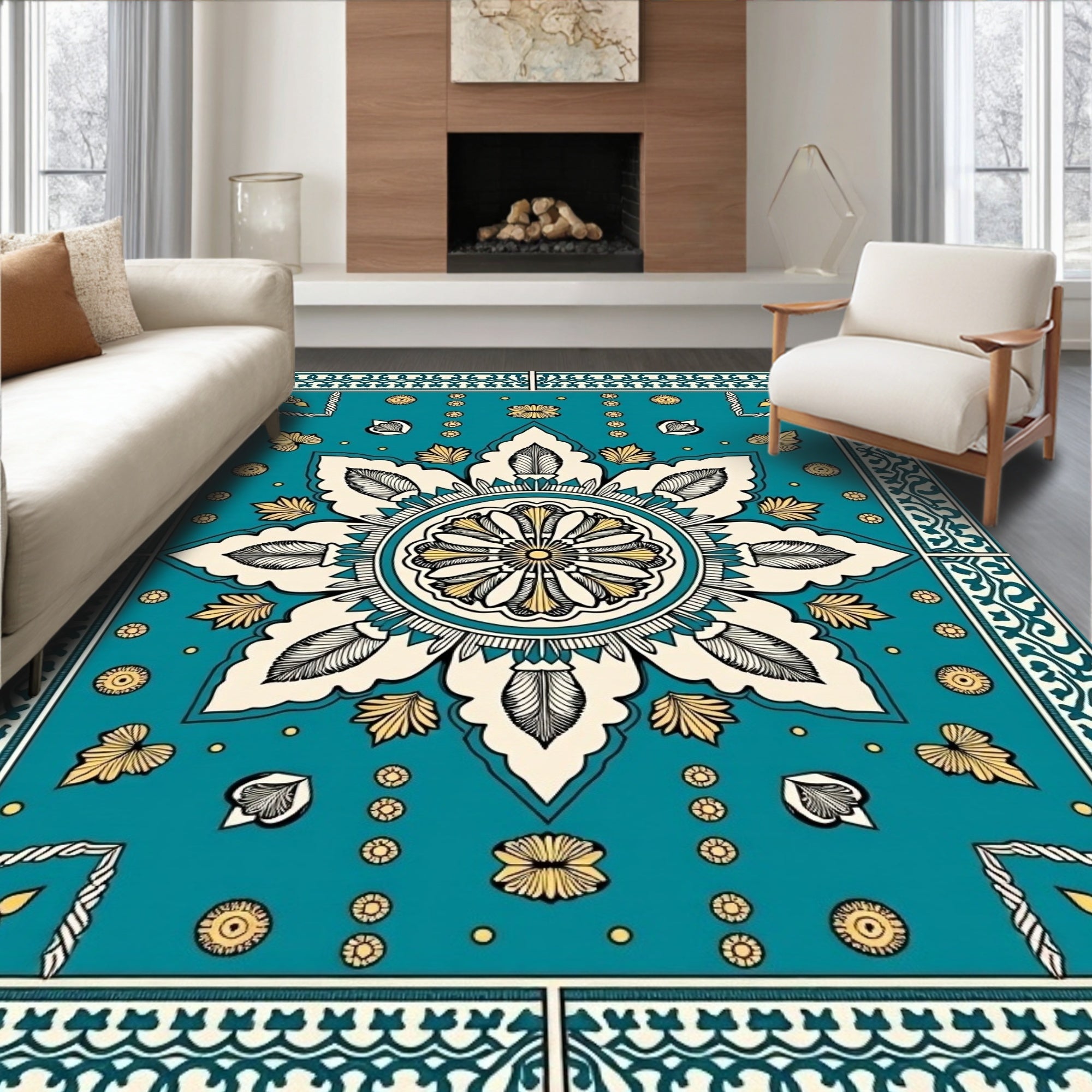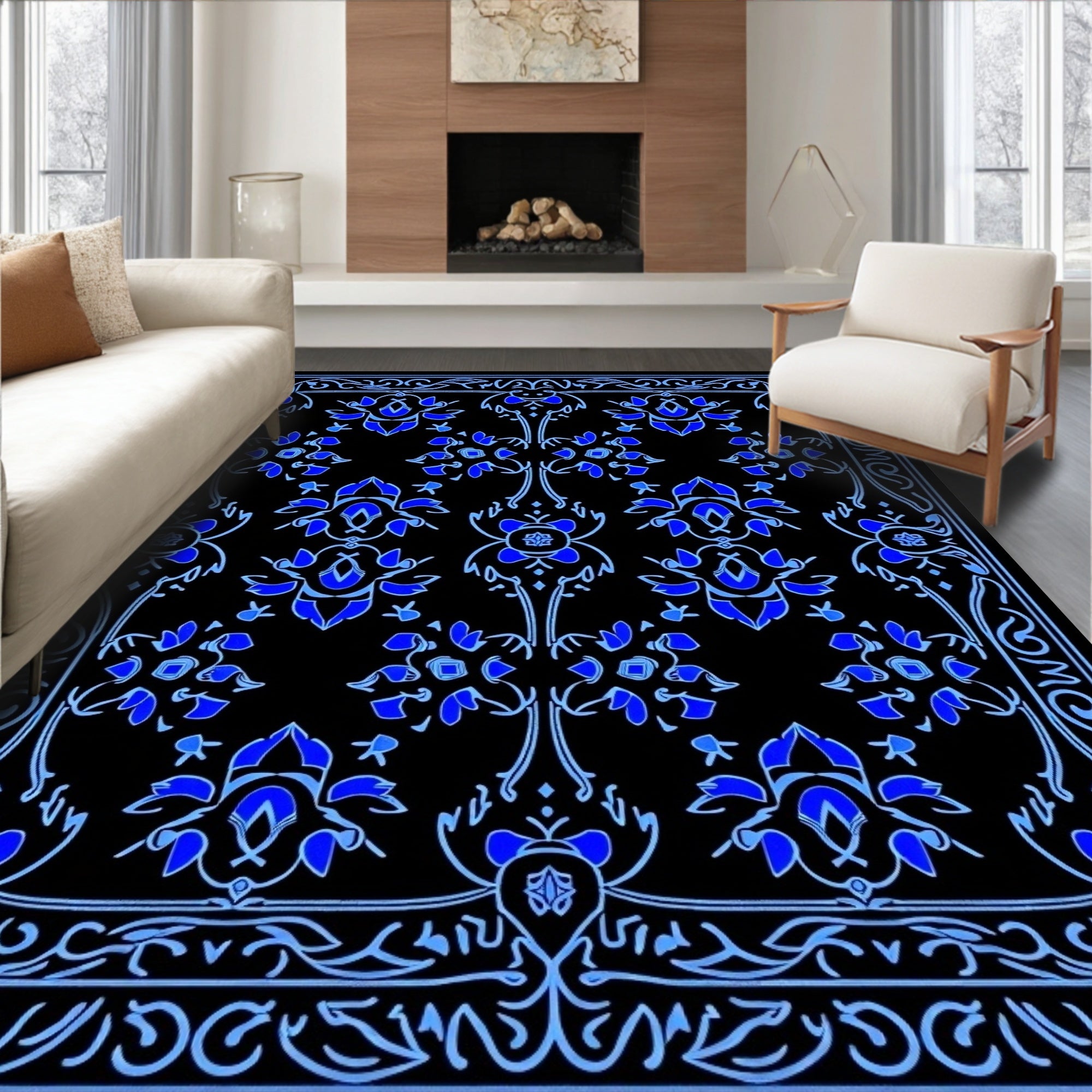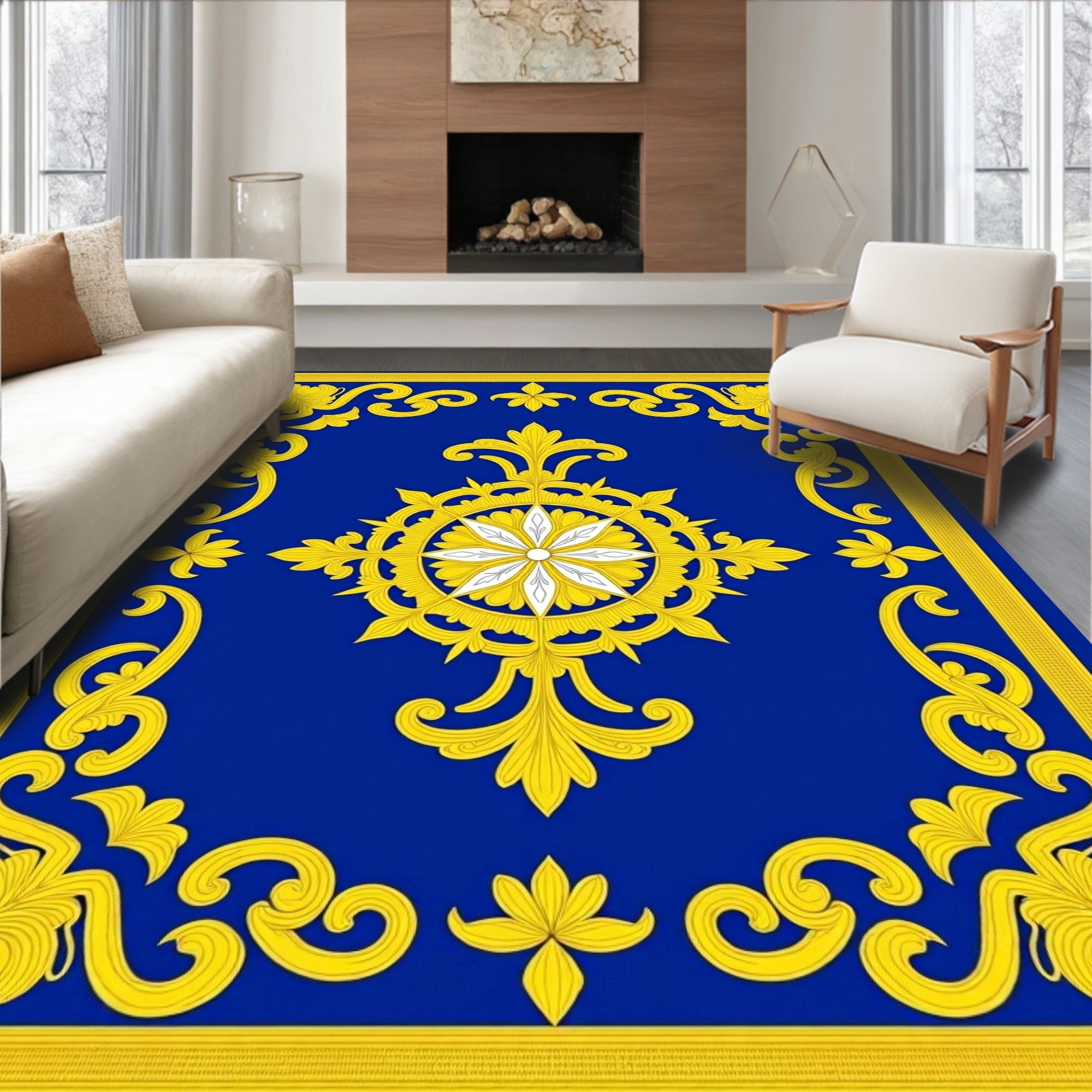 Ornate Floral Medallion Motif with Curved Scrollwork Details(Blue)