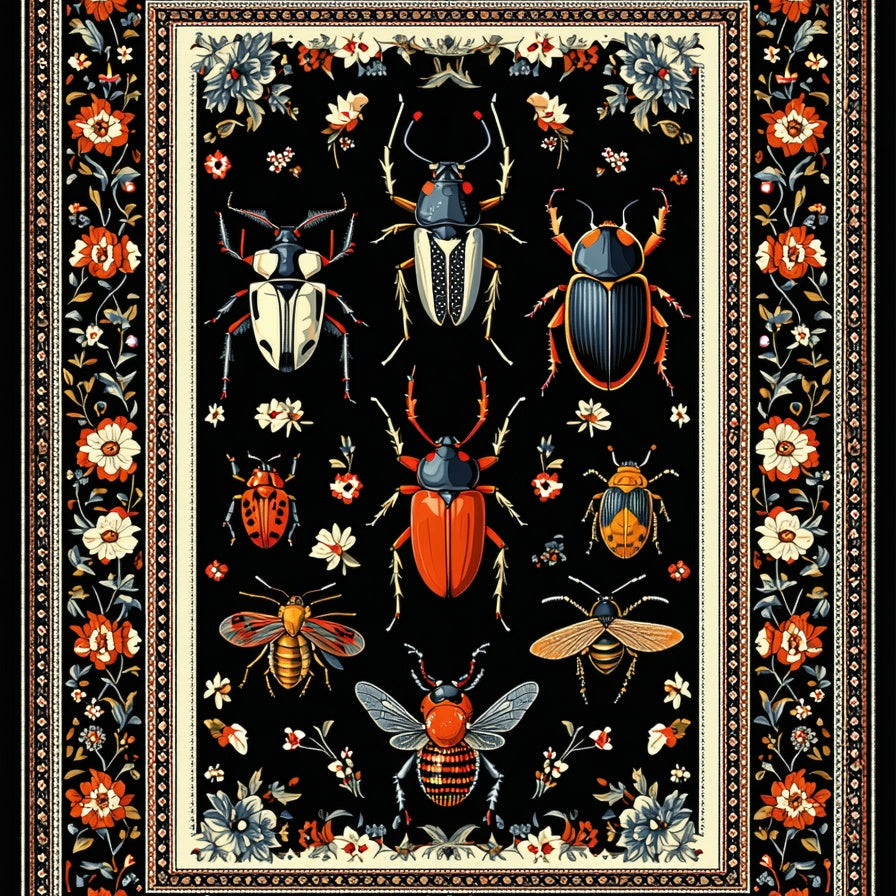 Antique Inspired Beetle and Bug with Interlaced Floral Elements(Black)