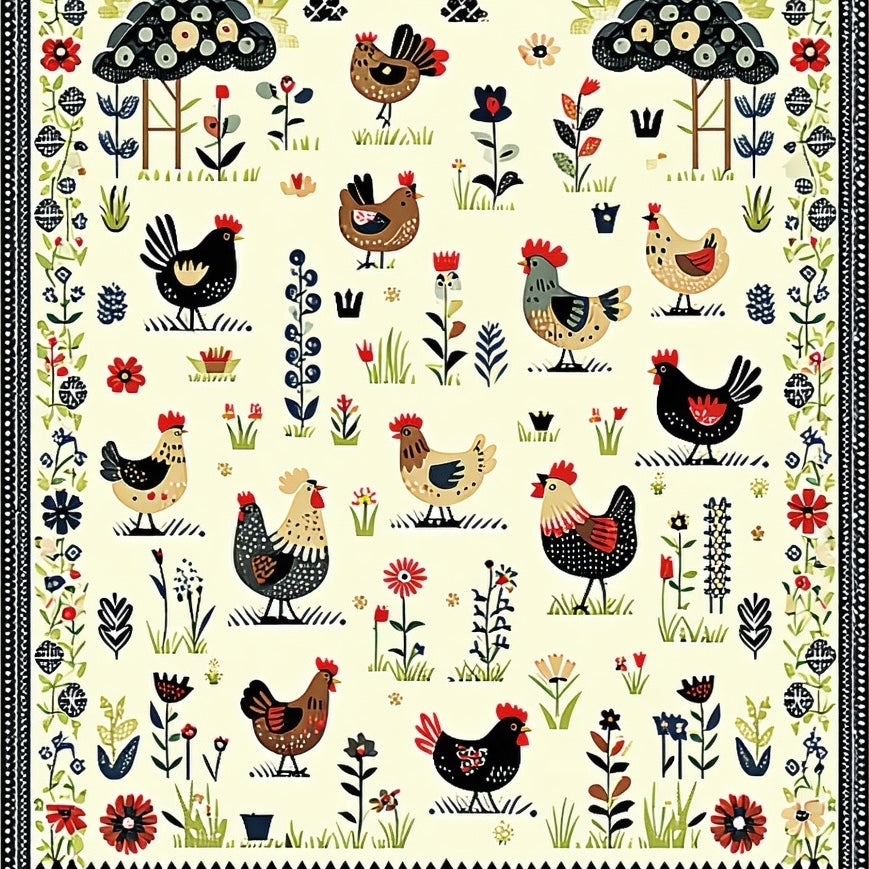 Whimsical Barnyard Chicken & Floral Rug(Ivory)