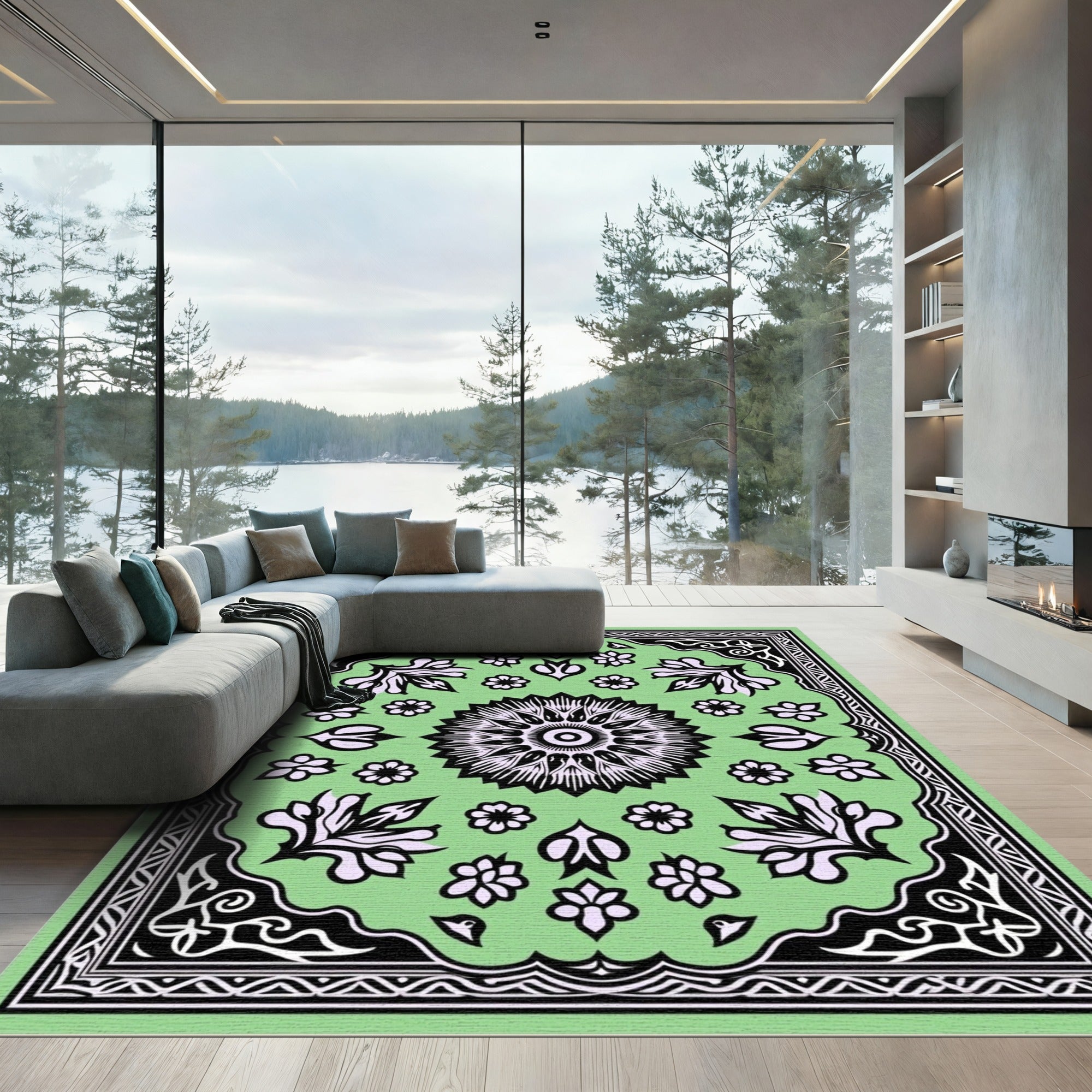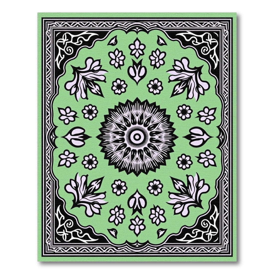 Pastel Green Floral Medallion Border Rug