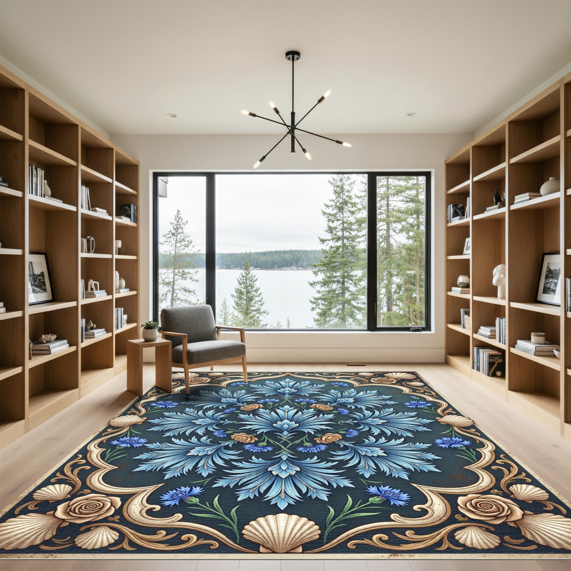 Inspired by the opulent botanical illustrations of the late Victorian era and the serene coastal motifs of early 20th-century seaside resorts, this rug offers a visual ode to nature's intricate beauty. The central fanned floral pattern, echoing the delicate symmetries found in antique damask or Gothic tracery, is brought to life by the vivid cornflower blues and soft blush roses, reminiscent of a lush garden captured at dawn. Accents of seashells and scrolling acanthus leaves, rendered in a warm ivory, speak to a life lived by the sea, evoking stories of gentle tides and sun-kissed shores. This design is for the soul that cherishes the quiet drama of natural forms and finds beauty in the enduring elegance of curated spaces. Imagine it anchoring a sun-drenched reading nook, transforming a sterile hallway into a verdant passage, or bringing a touch of refined romance to a master suite. It's more than just a floor covering; it's an invitation to slow down, to appreciate the meticulous artistry that surrounds us, and to weave a narrative of enduring beauty into the fabric of your home. Don't just furnish your space—imbue it with a timeless serenity.