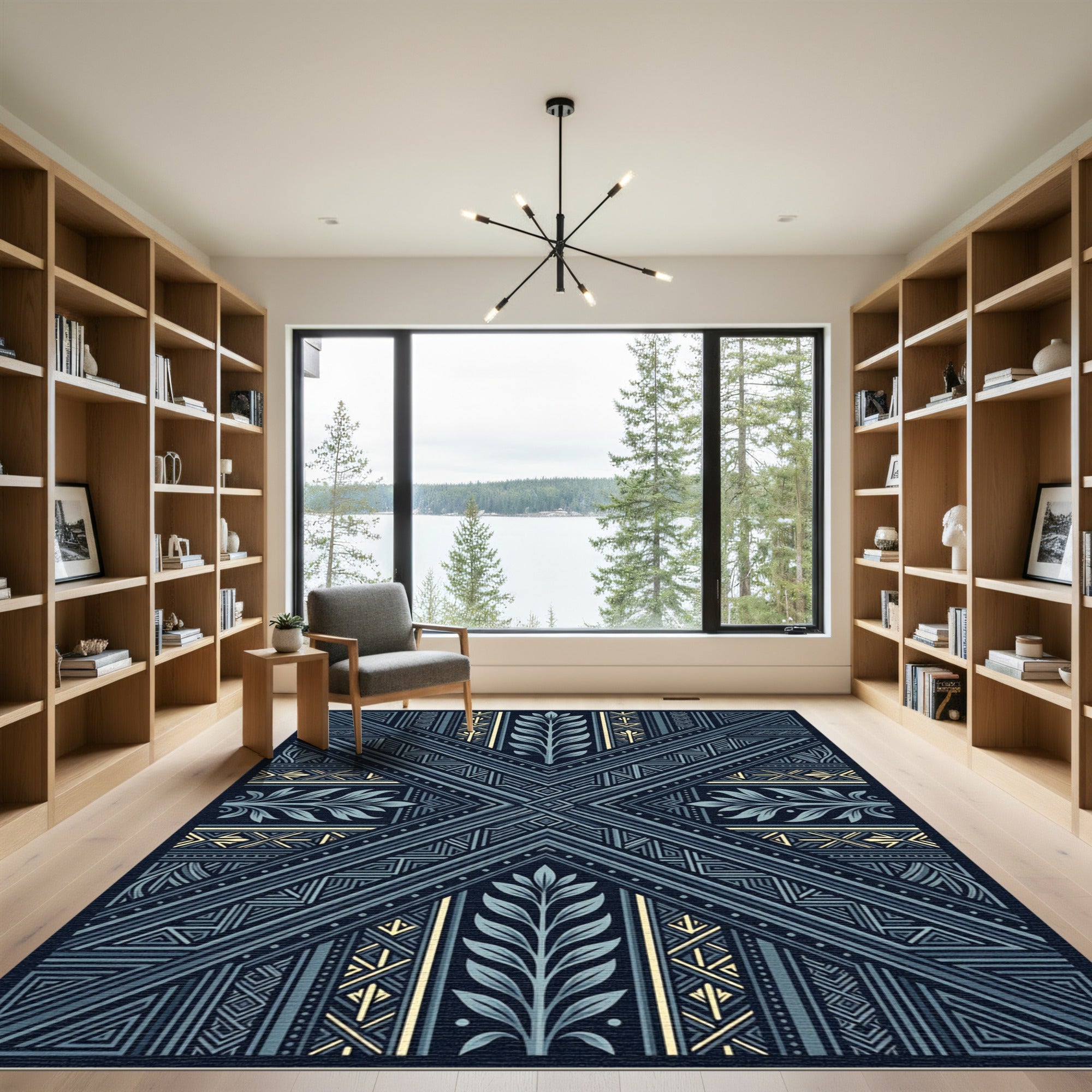 Introduce a striking blend of geometric precision and organic artistry to your living space with this captivating area rug. Dominated by deep, sophisticated blues and accented with subtle golden yellow, its intricate pattern offers a modern interpretation of classic design motifs, making it a versatile addition to any room. Crafted for longevity, this rug is not only durable but also machine washable, ensuring effortless maintenance. It's OEKO-TEX Standard 100 certified, guaranteeing it's free from harmful substances for your peace of mind. Perfect for high-traffic areas, this rug is available in various sizes to seamlessly complement your decor, from intimate nooks to expansive living rooms. Experience enduring style and practicality.