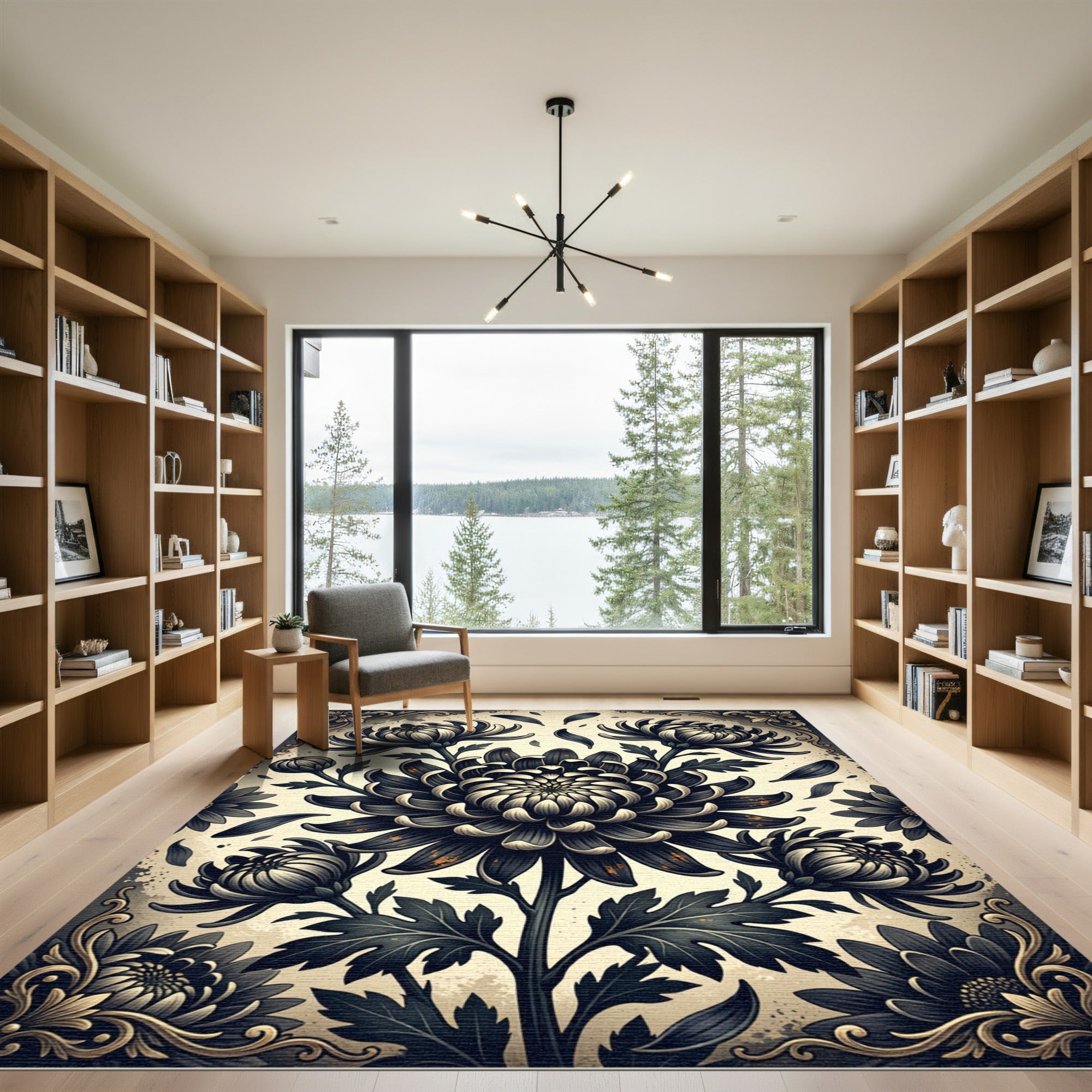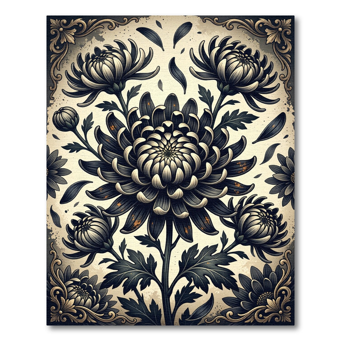 Drawing inspiration from the opulent floral motifs prevalent in Japanese Edo period woodblock prints and the dramatic, high-contrast aesthetics of Art Deco, this rug offers a visual story of enduring beauty and strength. The chrysanthemums, symbols of longevity and nobility, bloom with a stylized intensity, their dark, ink-like petals set against a soft, aged parchment background. Glimmers of gold, reminiscent of antique lacquerware, catch the light, adding a layer of understated luxury. This design is for the soul that finds beauty in shadow and light, appreciating the profound drama of nature's forms. Transform your living room into a tranquil sanctuary where the bold bloom commands attention, a sophisticated stage for quiet contemplation or intimate gatherings. No longer just a floor covering, this rug becomes a piece of art—a bold declaration of refined taste that whispers tales of ancient gardens and modern mystique. Live with intention. Embrace the dramatic.