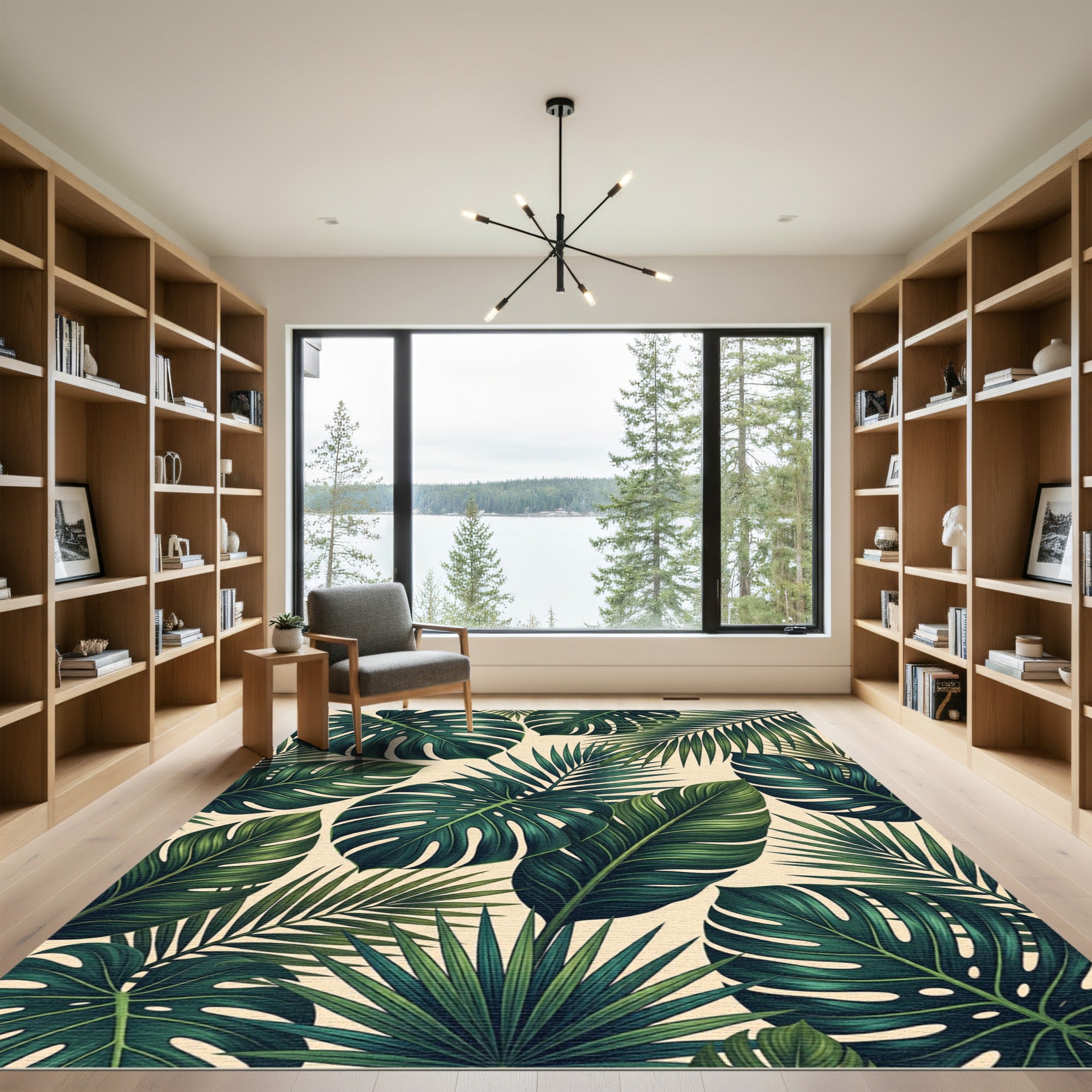 Immerse your space in the lush beauty of the tropics with this stunning Area Rug. Featuring a vibrant pattern of deep green monstera and palm leaves against a neutral backdrop, this rug brings an organic, natural feel to any room. Its durable construction is designed to withstand daily life, making it perfect for high-traffic areas like your living room or entryway. Plus, enjoy the ultimate convenience as this rug is machine washable, ensuring effortless upkeep and lasting freshness. Certified OEKO-TEX Standard 100, it guarantees a safe and healthy environment for your home. Available in sizes from small accent rugs to large area rugs, it scales from cozy corners to open living areas seamlessly.