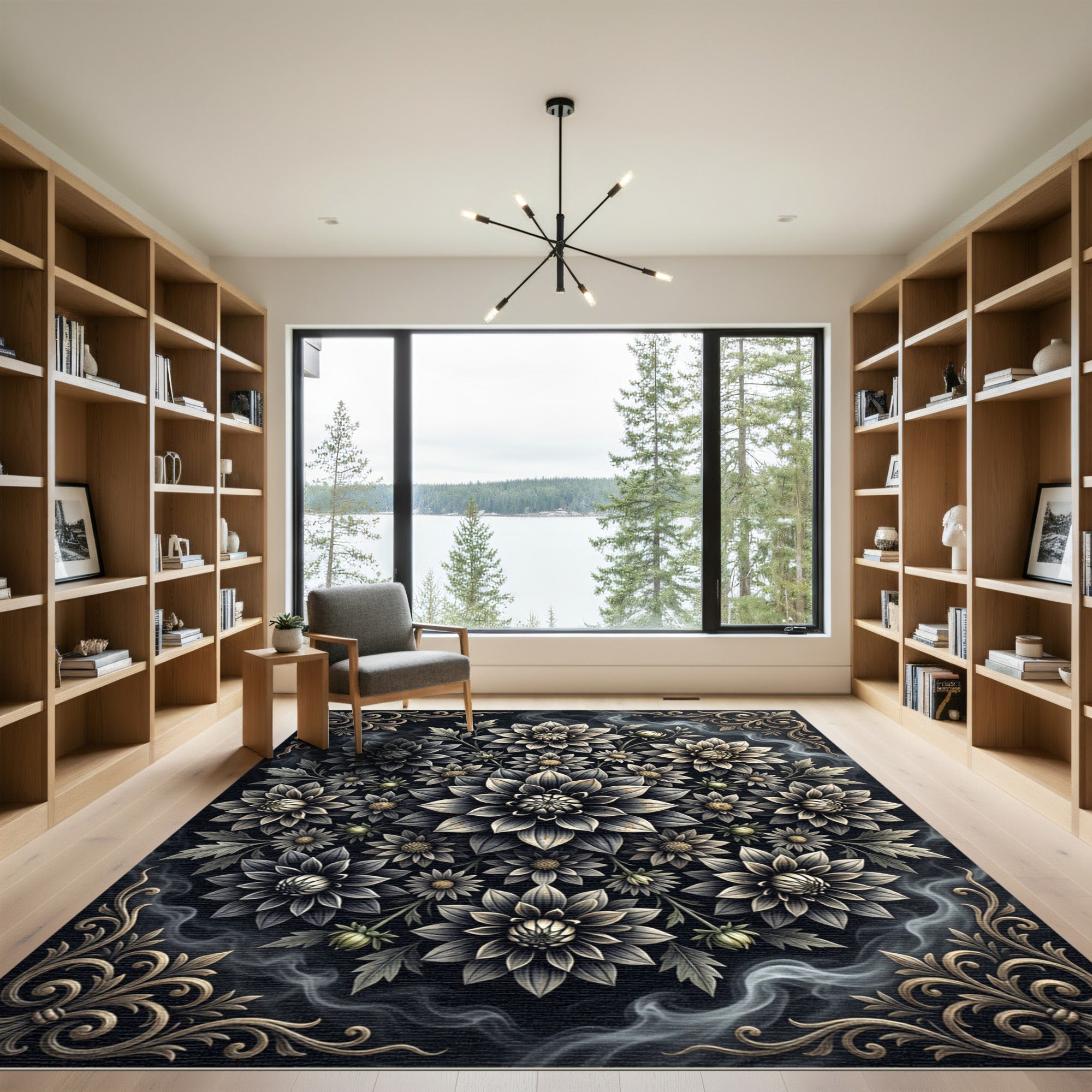 This rug is a visual ode to the opulence of Victorian era botanical studies, reinterpreted through a modern, almost gothic lens. The intricate floral mandala, with its layers of stylized dahlias and cascading foliage, evokes the drama of shadow play and the quiet intensity of a moonlit garden. Echoes of Art Nouveau's organic lines are present in the swirling arabesques that frame the central design, reminiscent of antique tapestries found in grand estates. Yet, its monochromatic palette and striking contrast imbue it with a contemporary edge, making it a perfect anchor for eclectic interiors or a statement piece in a minimalist scheme. For the soul drawn to the beauty of the dramatic and the enduring power of nature's artistry, this rug transforms a room from a mere dwelling into a sanctuary of quiet contemplation and sophisticated allure. Don't just cover your floor—make a statement of enduring elegance.