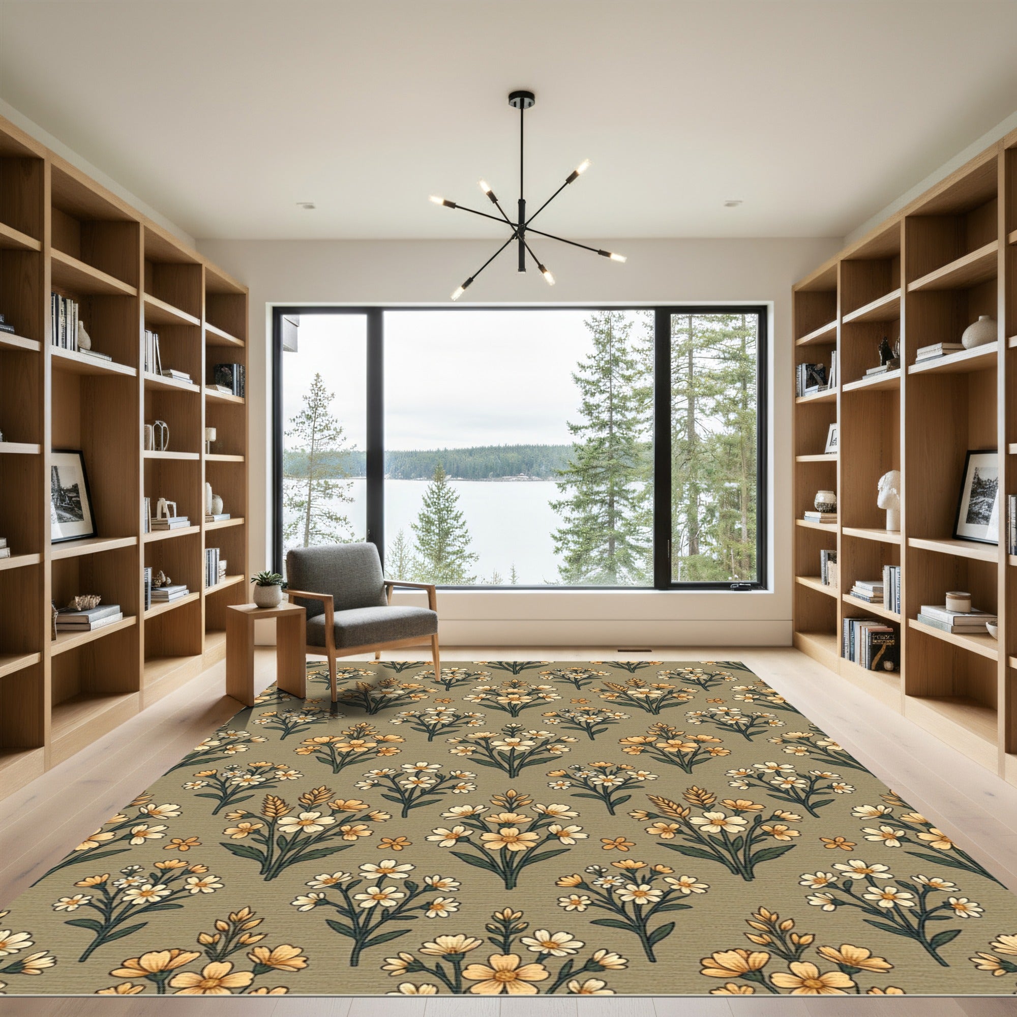 Rooted in the quiet tradition of Arts and Crafts movement botanicals, this design serves as a contemporary homage to the rhythmic, stylized nature motifs of William Morris, reimagined for the modern home. The earthy, muted tones evoke the sun-drenched pastoral landscapes of midcentury Pacific Northwest imagery, where small wildflower bouquets dance across a field of soft, organic gray. Each petal is rendered with clean, graphic intent, turning a floor covering into a sprawling meadow of hushed elegance. When you roll this out, the room undergoes a sudden, breath-filled transformation—the space softens, ambient light feels warmer, and the frantic pace of the outside world recedes. It is designed for the inhabitant who pursues slow joy and curate-led comfort, a person who understands that true, lasting style is found in the understated details. Don't just fill your space—anchor it. Step into this scene and let your home become a sanctuary of calm, refined nature.