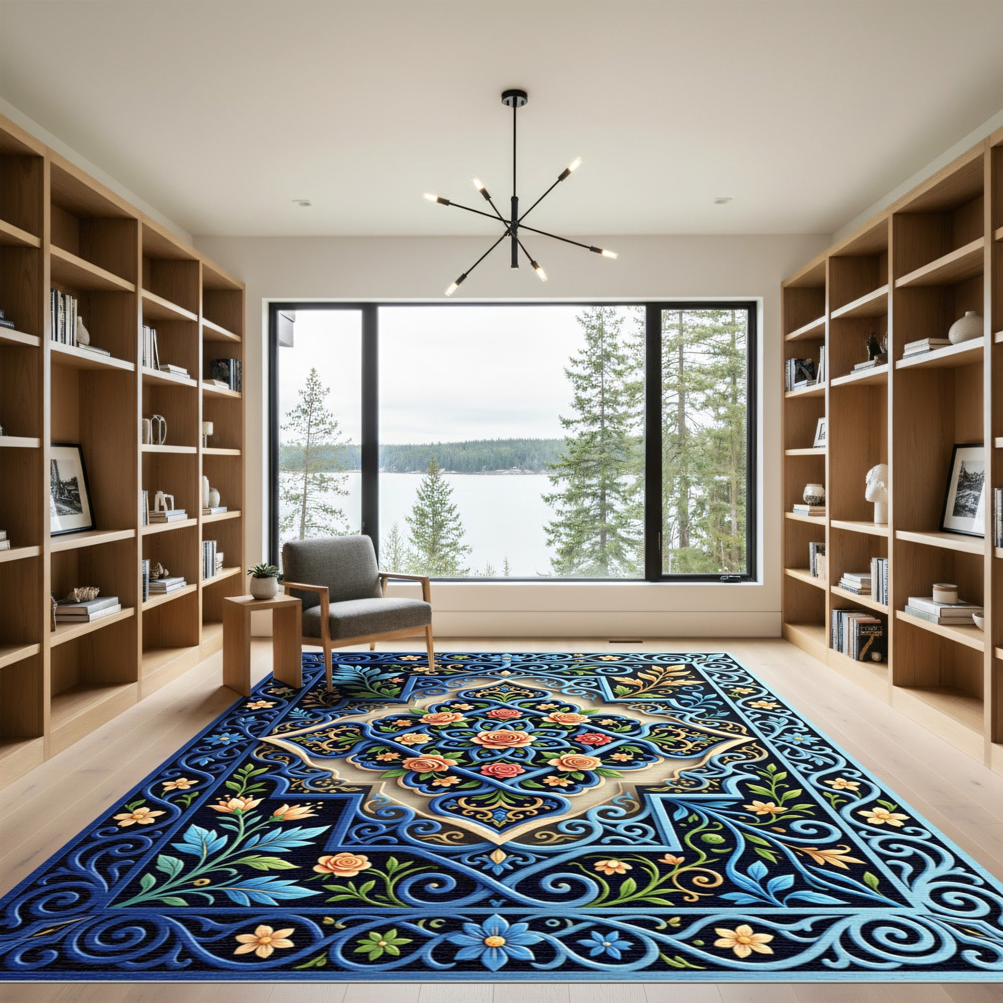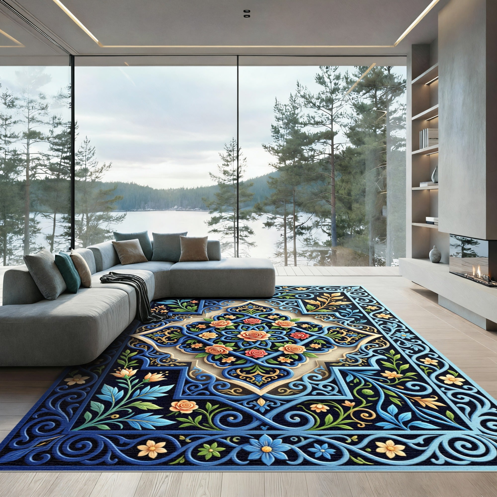 Drawing inspiration from the opulent gardens of Persia and the intricate tilework of Moroccan riads, this rug is a narrative woven in thread. It echoes the 'Arabesque' tradition, where nature's forms—vines, flowers, and scrolled leaves—dance in a never-ending arabesque, a visual testament to craftsmanship spanning centuries. The central medallion, a bloom of coral roses and golden acanthus, is framed by the deep azure of a twilight sky, while cobalt borders unfurl like an ancient illuminated manuscript. This is for the soul that finds solace in beauty, the collector of quiet stories. Place it in your home, and watch the room transform from mere space into an enchanted courtyard, where every glance invites a moment of contemplation, and the air hums with the echoes of distant bazaars and sun-drenched patios. This is not merely a rug; it is an invitation to wander through a tapestry of dreams, a daily descent into exquisite artistry. Live with stories. Walk upon wonder.