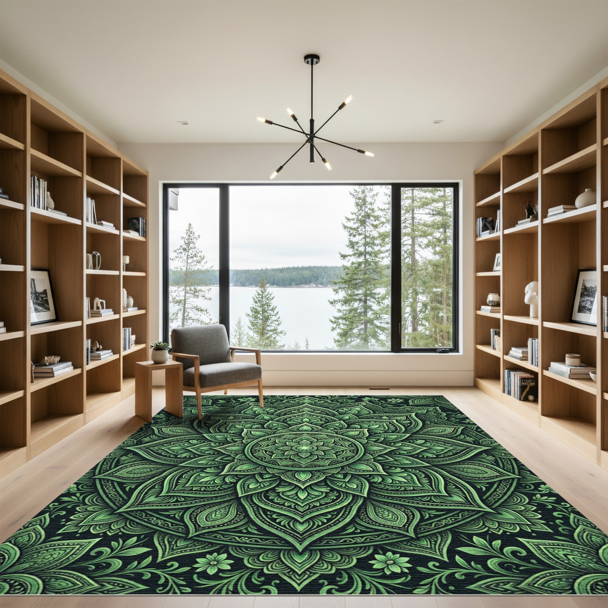 Infuse your living space with the captivating beauty of this intricate floral mandala Area Rug. Its mesmerizing design, rendered in rich emerald green and deep charcoal, offers a striking contrast that draws the eye. Crafted for longevity, this durable rug is perfect for high-traffic areas in your living room or entryway. Beyond its stunning aesthetic, the rug is conveniently machine washable, making upkeep simple and stress-free. Certified OEKO-TEX Standard 100, it ensures a safe and healthy environment for your home. Available in sizes from small accent rugs to large area rugs, this piece seamlessly scales from cozy corners to open living areas, adding a touch of bohemian elegance and timeless appeal to any modern or eclectic decor.