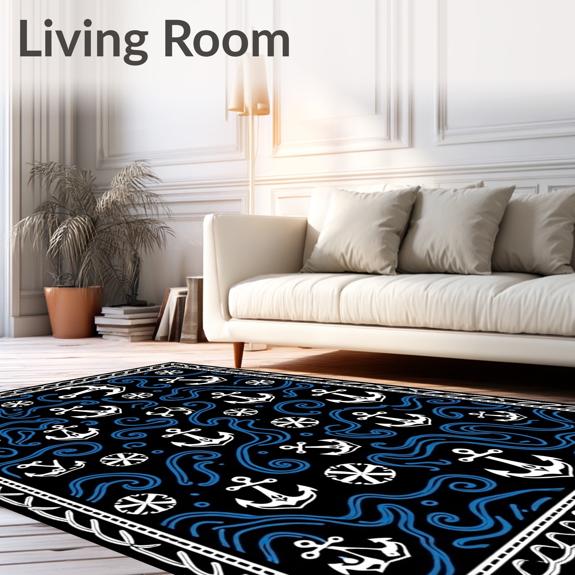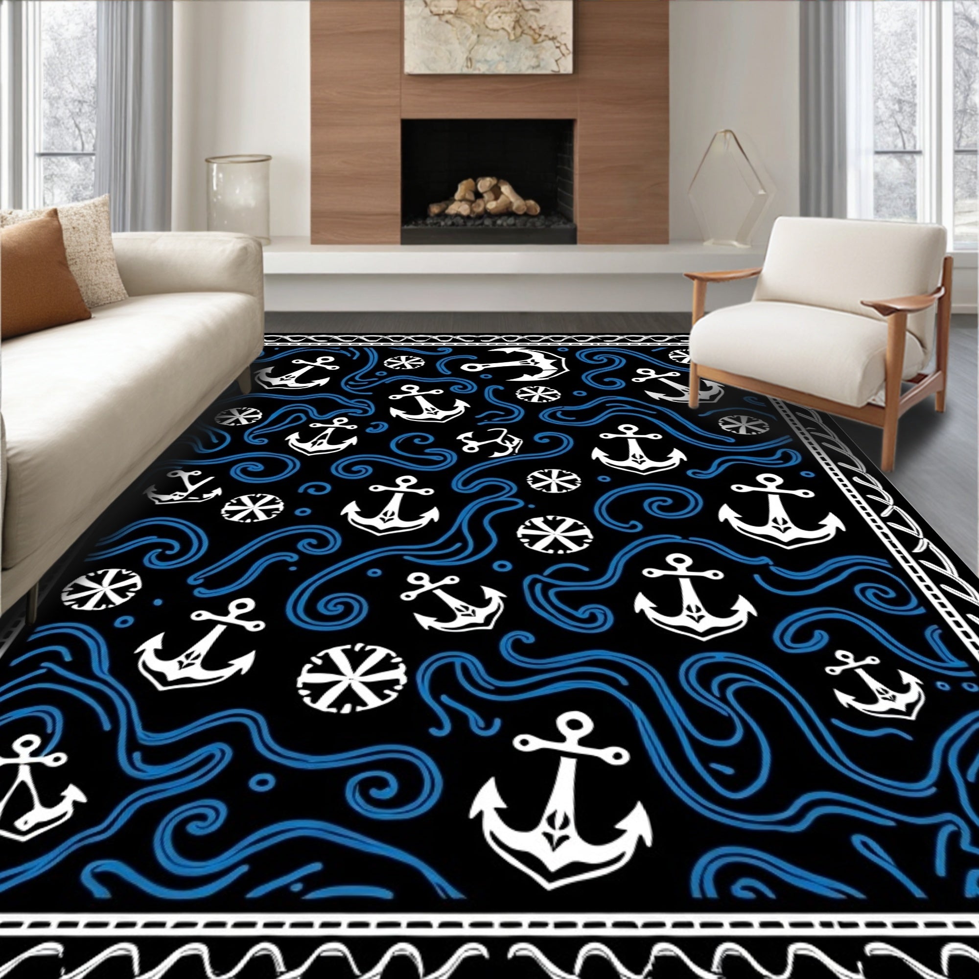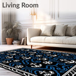 Flatwoven High Traffic Area Rug, Anchor Nautical Wave with Compass Rose Design, Non Slip, Stain Resistant, Washable Area Rugs for Living Room, Bedroom (Black) Overview: