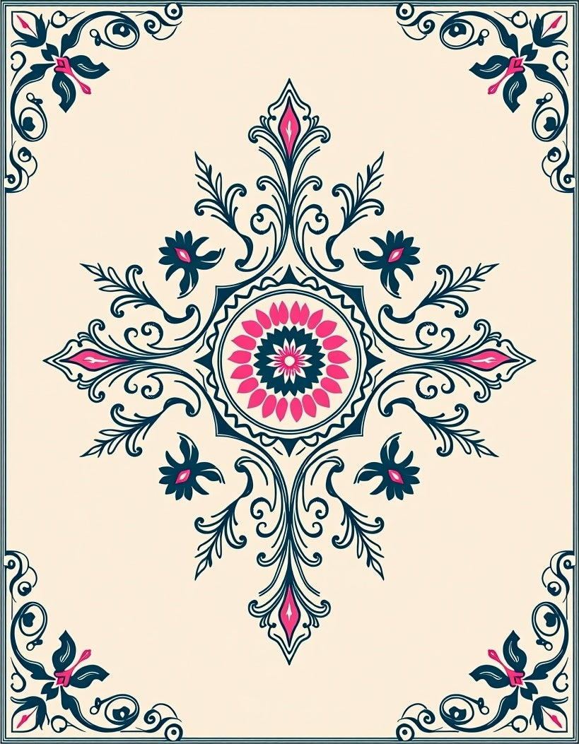Artisan Boho Floral Medallion Motif with Whimsical Vine Accents (Beige)