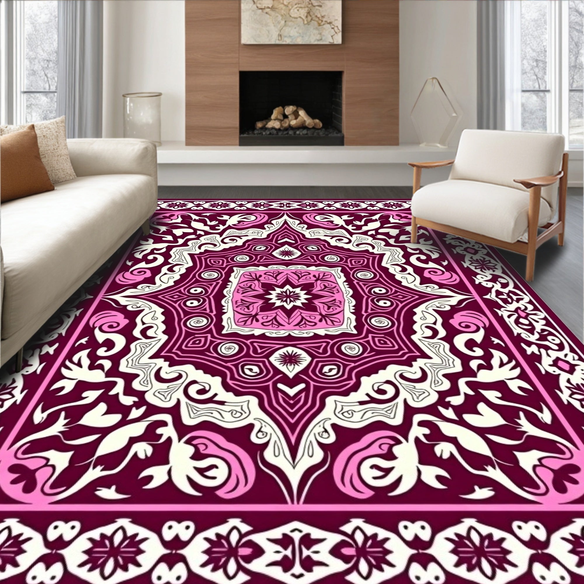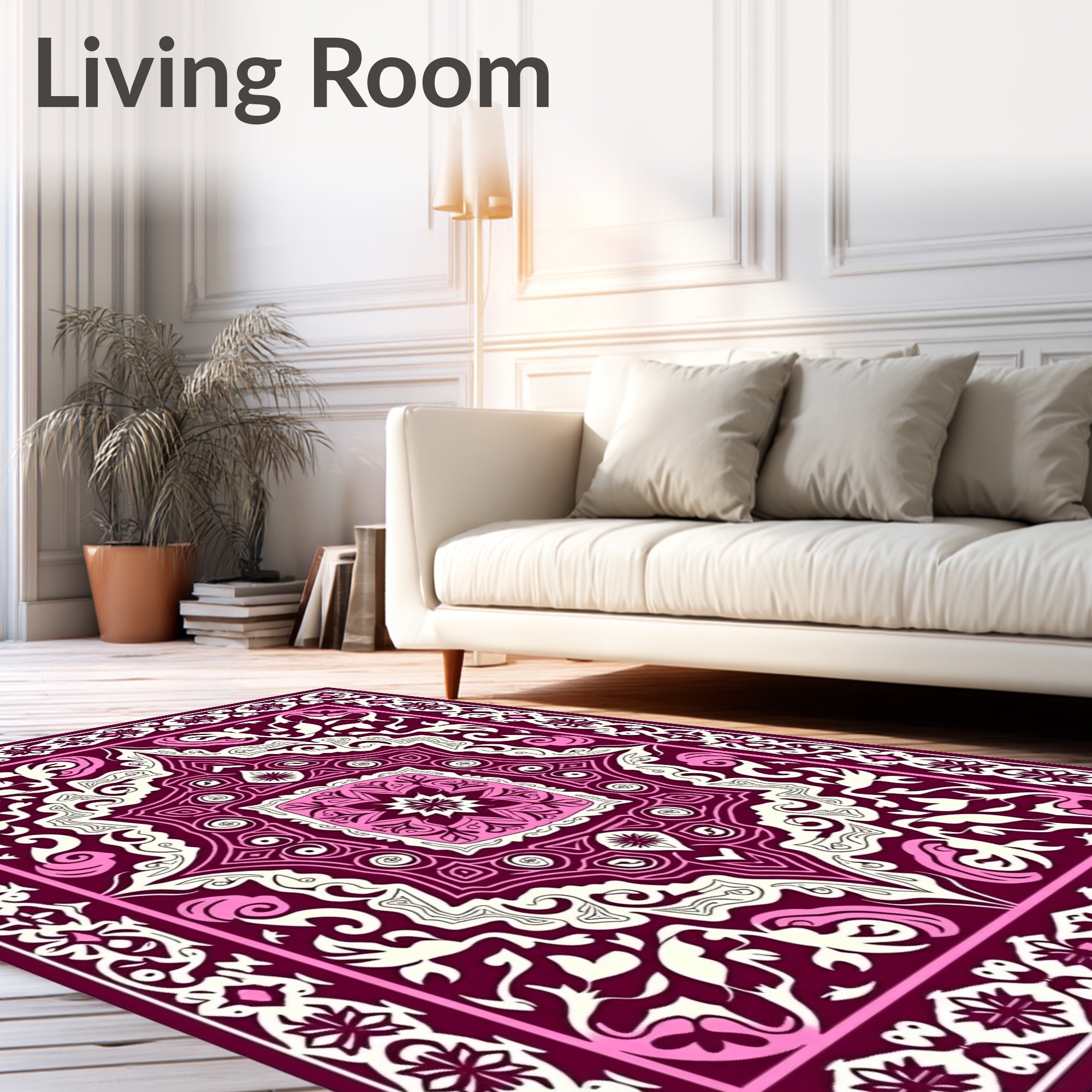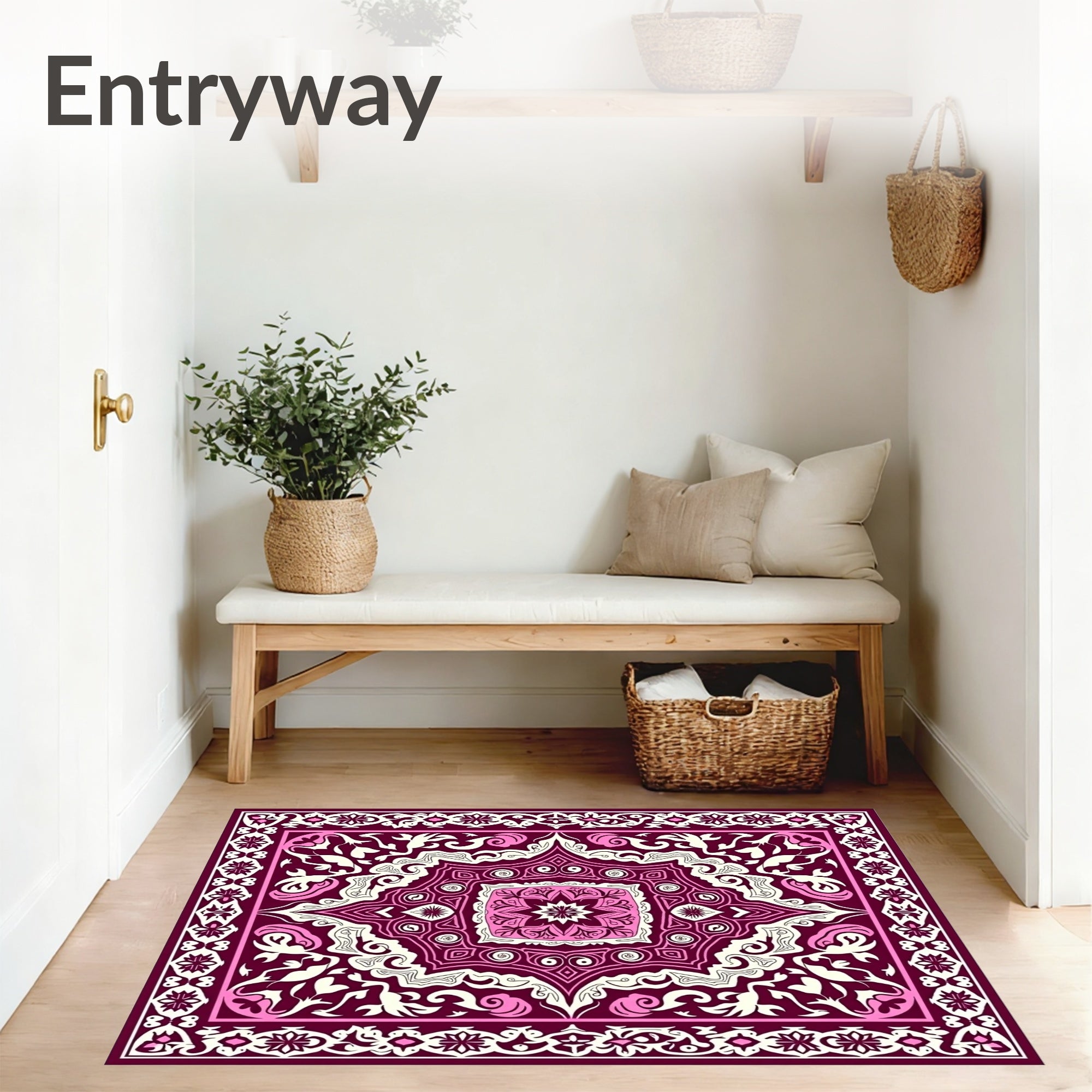 Flatwoven High Traffic Area Rug, Artisan Mosaic Inspired by Interlocking Florals and Decorative Leafy Swirls, Non Slip, Stain Resistant, Washable Area Rugs for Living Room, Bedroom (Purple) Overview: