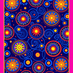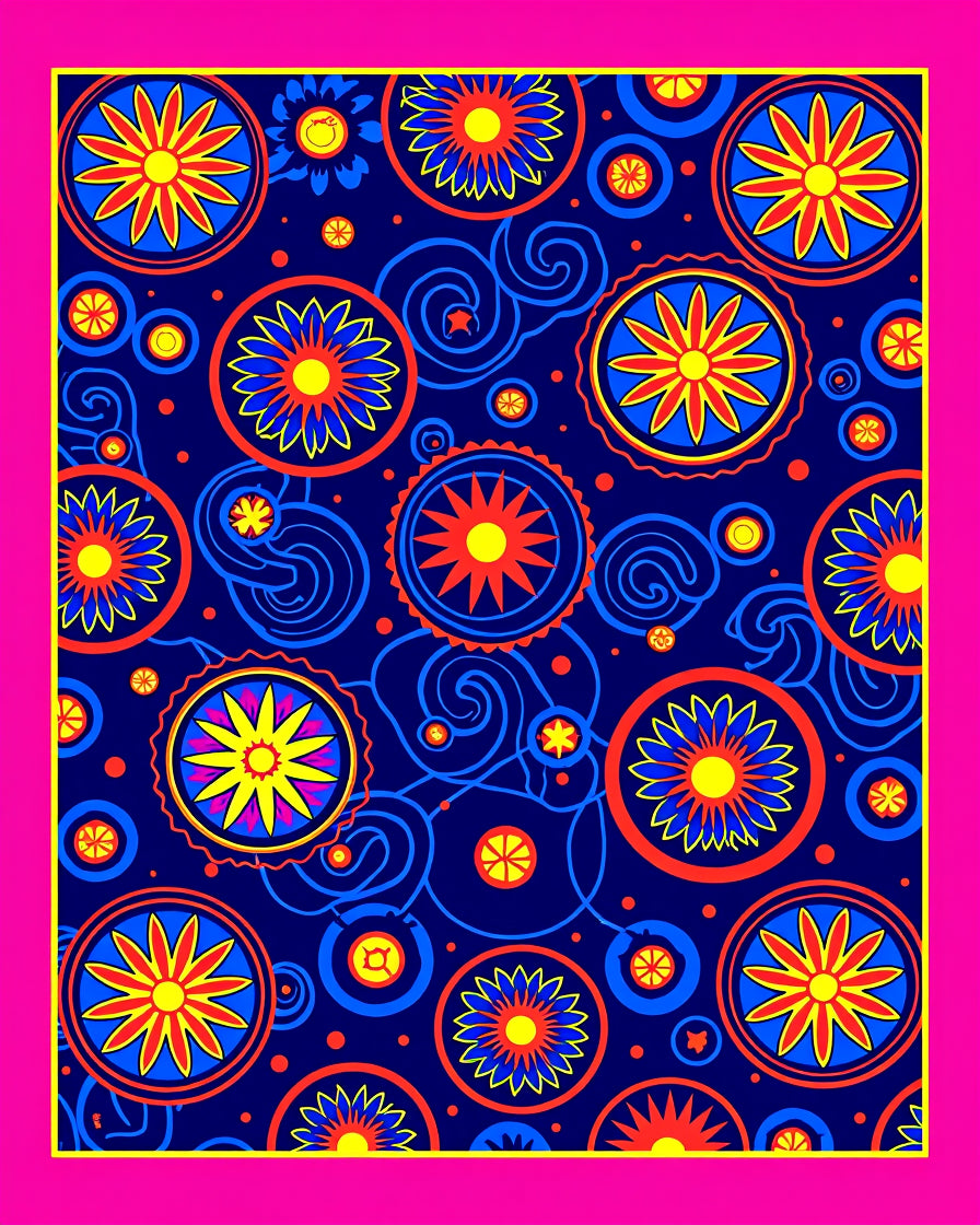 Astronomical Galaxy Featuring Orbiting Spheres and Starbursts (Pink)