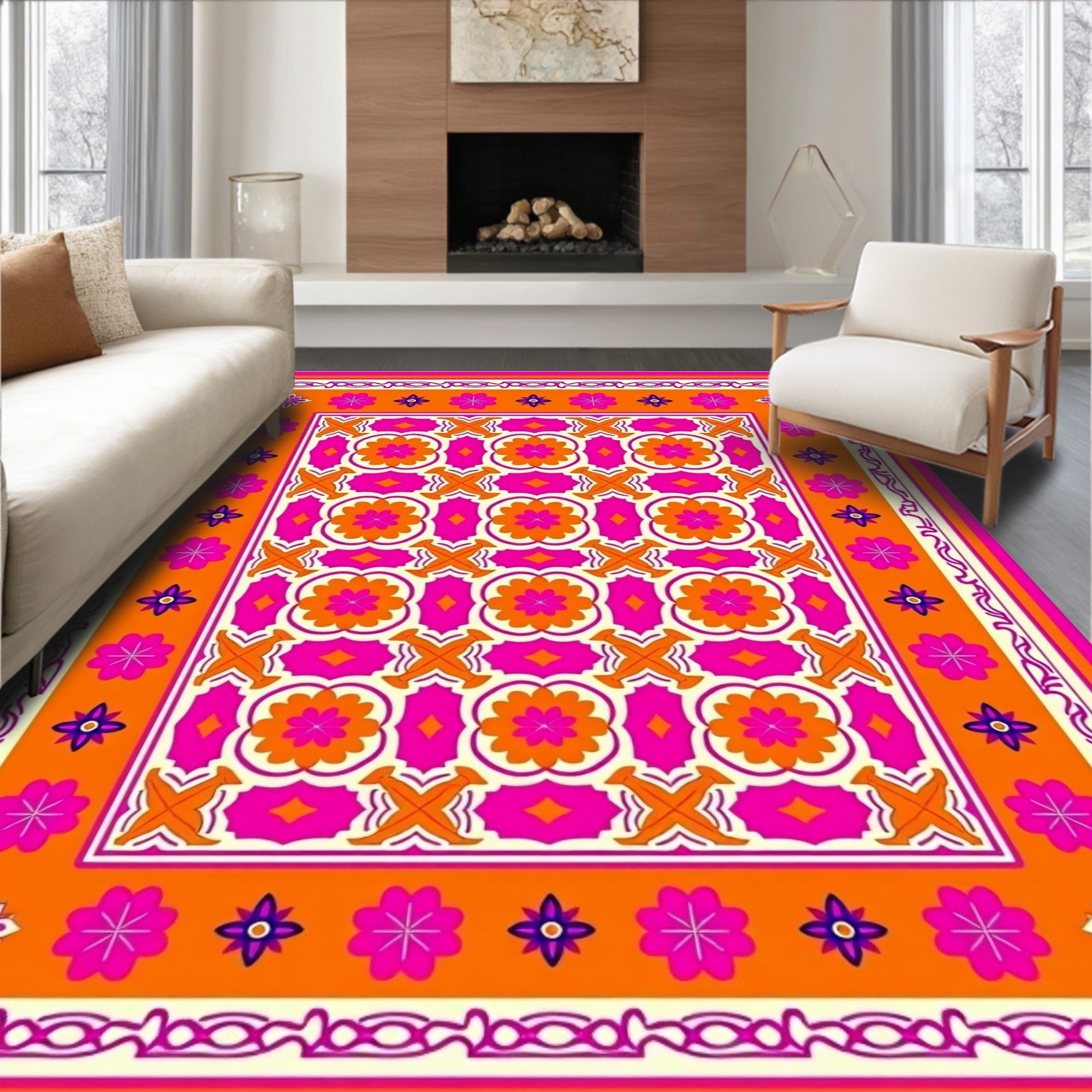 Flatwoven High Traffic Area Rug, Boho Chic Interlocking Floral Motifs with Artistic Symmetry, Non Slip, Stain Resistant, Washable Area Rugs for Living Room, Bedroom (Orange) Overview: