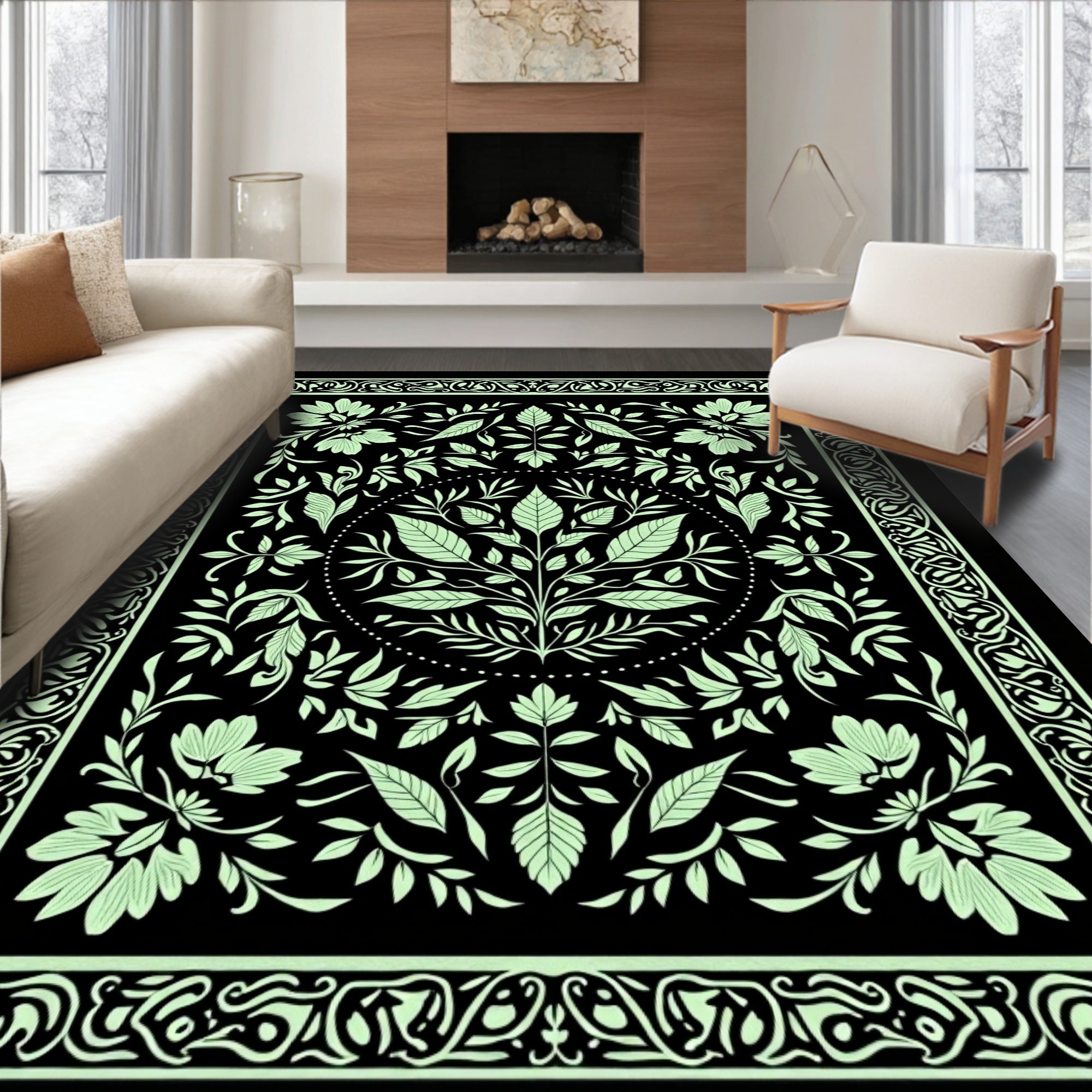 Flatwoven High Traffic Area Rug, Botanical Woodland Creatures Tapestry With Floral Jungle Motifs, Non Slip, Stain Resistant, Washable Area Rugs for Living Room, Bedroom (Black) Overview: