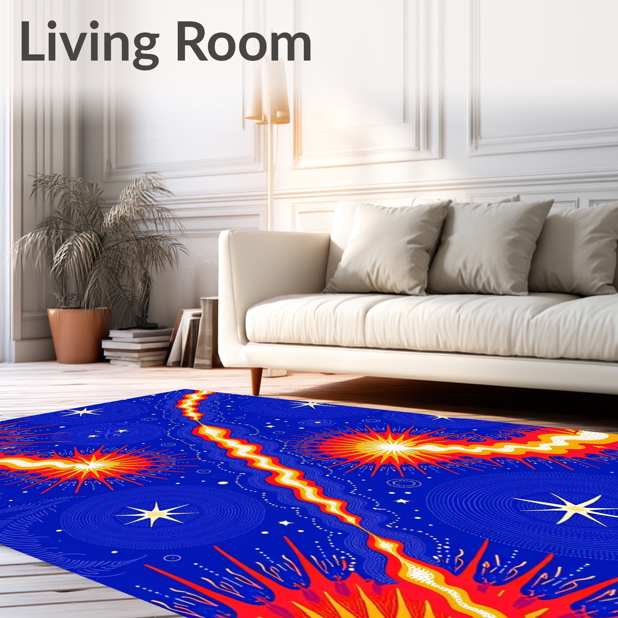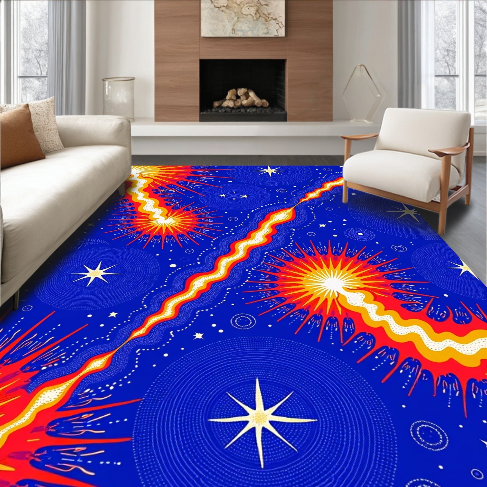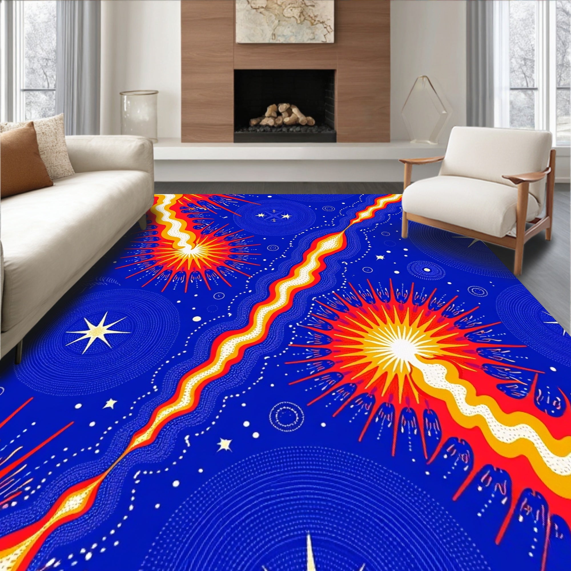 Flatwoven High Traffic Area Rug, Cosmic Swirl with Interlocking Flares and Starlit Comets, Non Slip, Stain Resistant, Washable Area Rugs for Living Room, Bedroom (Blue) Overview: